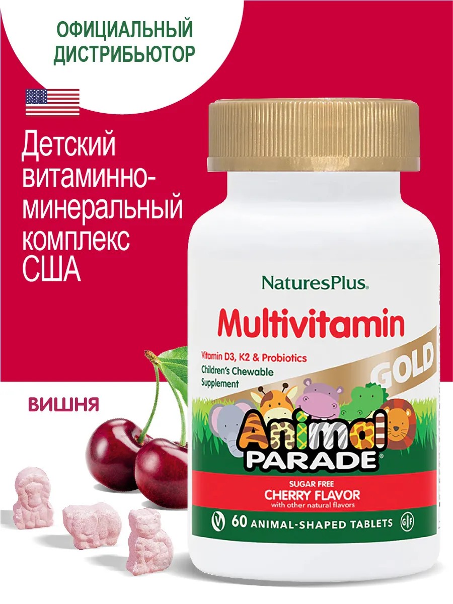 Мультивитаминные комплексы для детей Animal PARADE GOLD Multi в форме животных со вкусом вишни, 500 МЕ (13 мкг) витамина D3 и витамина К2 для поддержки костного и кровяного здоровья и здоровой иммунной системы. Лютеин в составе улучшает зрение и кожу. Подслащены ксилитом, что снижает риск кариеса. Поддерживает нормальный рост и развитие ребенка.