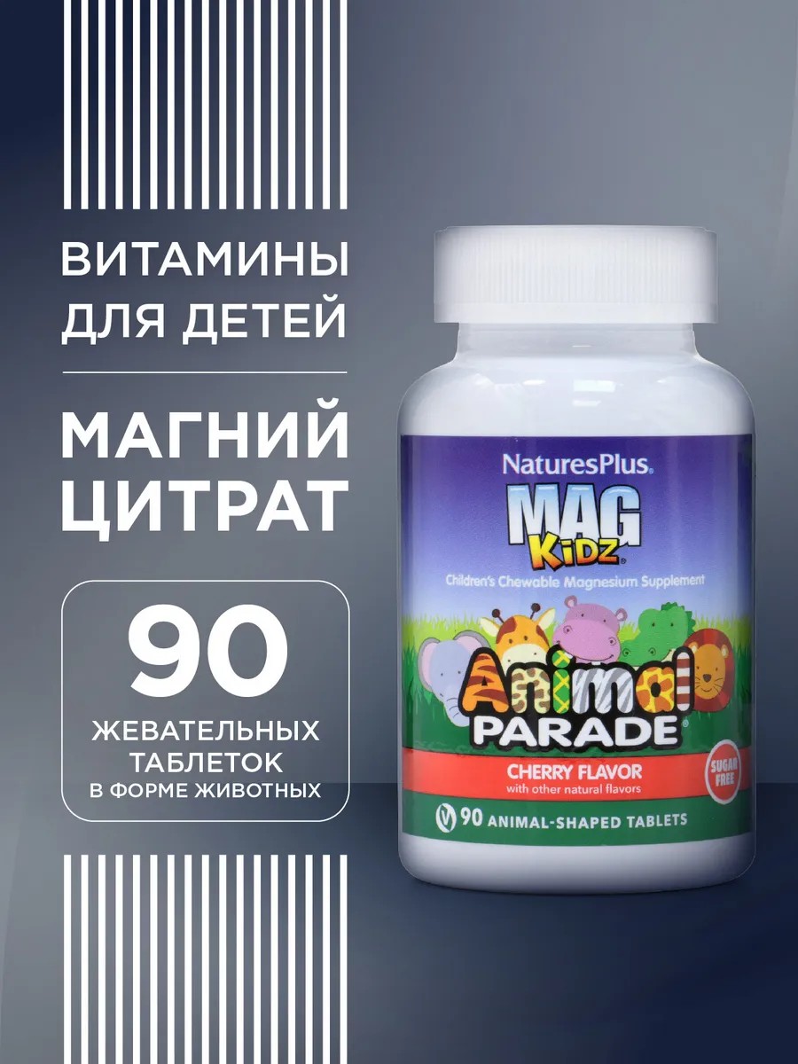 БАД Animal parade — это вкусные жевательные пастилки, которые является источником магния для вашего малыша . Детские витамины для школьников Энимал парад зверят magnesium citrate с вишневым вкусом содержит цельный, натуральный и жизненно необходимый магний в той доступной , вкусной и забавной форме, которую полюбят ваши дети. Этот элемент — крайне важный, который часто не учитывают при составлении рациона питания детей, что приводит в будущем к проблемам со здоровьем. Существуют такие формы магний как цитрат таурат карбонат глицинат и др. Наиболее лучшая форма усваиваемая в организме ребенка - это магнезиум цитрат. Mag Kidz Animal Parade Natures Plus легко и быстро усваивается в организме так как хорошо растроряется в воде. Американский бренд Animal Parade принадлежит группе Nature's Plus (США)и давно зарекомендовал себя на рынке пищевых добавок. Свойства Бада для детей: расслабление и успокоение мышц, развитие крепкой и здоровой костной и мышечной системы, зубов; улучшение общего самочувствия; принимает активное участие в метаболизме, для роста детей.
