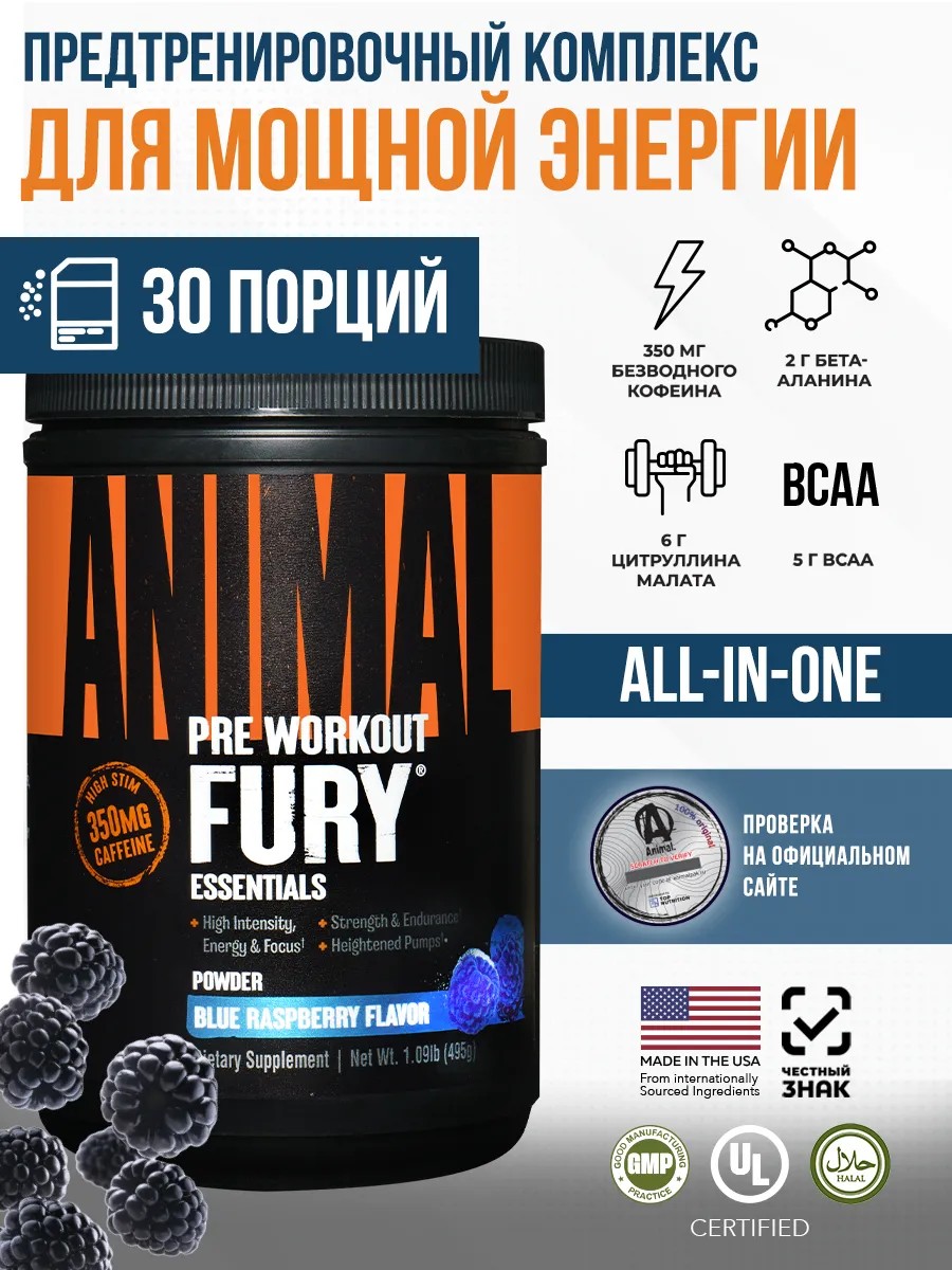 Animal Fury – это лучший выбор среди спортивного питания для мужчин и женщин, стремящихся к максимальным результатам. Поддержите свою физическую форму, выносливость и восстановление после тренировок с этим высокоэффективным предтренировочным комплексом!