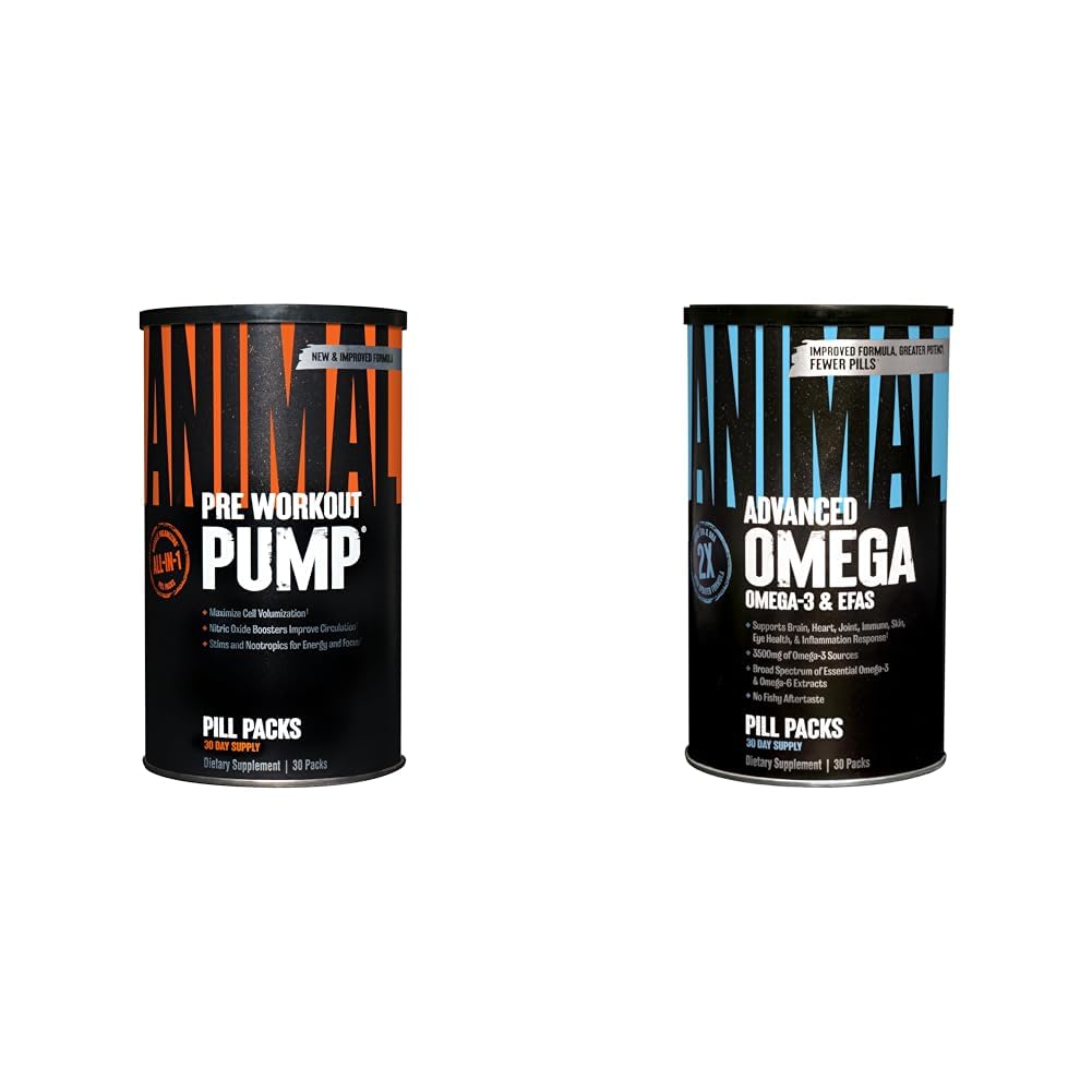 Get extreme muscle pumps and lasting energy plus heart, joint, and metabolism support with this power duo bundle. Animal Pump packs a powerful pre-workout punch with creatine, arginine, green tea and more to expand your veins and boost strength. The convenient single-serve packets make precise stim-free or stim-loaded dosing easy anytime, anywhere. Complement intense workouts by adding Animal Omega's pharmaceutical-grade omega-3, -6 and -9 blend which research shows can reduce inflammation, support cardiovascular function and testosterone production. With 30 daily packs providing a variety of 10 pure omega sources paired with an absorption complex, this comprehensive fish, flaxseed and salmon oil formula is designed to fill nutritional gaps hard-training bodybuilders often overlook. Together this bundle combines intense, customized pre-workout power with essential fatty acids that enhance performance, health and physique.