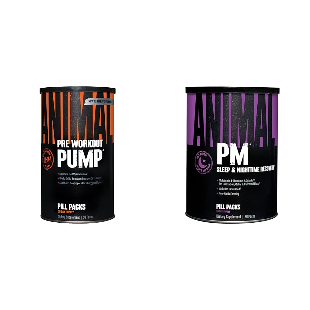 The Animal Pump and Animal PM bundle is the ultimate combination for energy, performance, and recovery. Animal Pump is a complete pre-workout supplement that provides intense energy, focus, pumps, and strength for your toughest workouts. It contains a blend of creatine, arginine, green tea extract, and other key ingredients. The stimulant complex can also be removed for late night workouts. Animal PM is a nighttime recovery complex containing Zinc, Magnesium, Vitamin B6, GABA, and AKG to promote restful sleep, boost growth hormone levels, and maximize muscle recovery while you rest. With Animal Pump to power you through intense training sessions and Animal PM to make the most of your downtime, this bundle has you covered before, during, and after your workouts.Animal Pump lets you customize your pre-workout energy level by removing the stimulant pill, while Animal PM is non-habit forming. Trusted by professional bodybuilders for over 30 years, Animal creates high-quality supplements manufactured in their own cGMP facility. Both Animal Pump and Animal PM come in easy-to-take individual packets, perfect for on-the-go use or leaving by your nightstand. Animal PM nighttime supplement features GABA, AKG, zinc, magnesium and more to naturally boost GH levels and promote restful sleep. Animal Pump pre-workout combines multiple supplements like creatine, arginine, and green tea extract into one convenient packet for intense energy, pumps, and focus.
