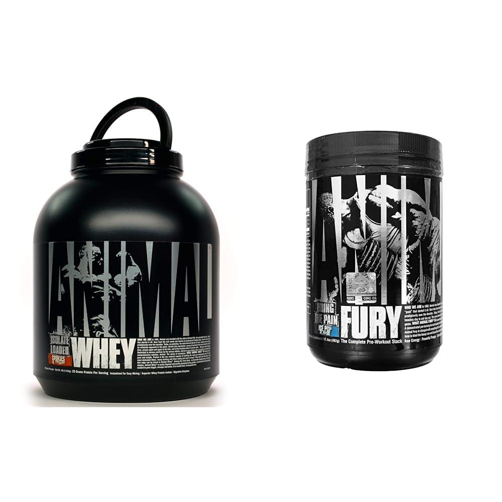Animal Whey Isolate Protein Powder, Loaded for Post Workout and Recovery, Cookies & Cream, 4 Pound, 64 Oz Rich in prized whey protein isolate, fortified by digestive enzymes, mixes easily. A whopping 25 grams of protein per scoop. And it tastes great. We endeavored to create the ideal bodybuilding protein source, one worthy of the thirty-plus year Animal legacy, and the accolades garnered in the trenches assure us that this enterprise was a success. Never ones to settle, however, we continue to push for excellence. Animal Fury - Pre Workout Powder Supplement for Energy and Focus - 5g BCAA, 350mg Caffeine, Nitric Oxide, Without Creatine - Powerful Stimulant for Bodybuilders - Ice Pop, 30 count Animal Fury is a powerful and effective pre-workout powder that's stripped down to the very core. All the fluff is left out, leaving just the purest dosages of the most impactful pre-training ingredients available. Animal Fury is suitable for any serious athlete as it's effective, easy to use, convenient, and comes in several delicious, easy-to-mix flavors.Product 2: Trusted by the Pros - Animal has been a leading name for the highest level of professional bodybuilders for over 30 years. Don't compromise, take what the pros take. Product 2: Creatine free formula is perfect for any athlete in a bulk or cut season. A no non-sense formula designed for both men and women. Product 2: Animal Fury powder mixes easily in 12oz. of water or your drink of choice, and packs a powerful and delicious taste for all athletes. Vein popping pumps, nitric oxide, high energy and focus every single workout. Product 2: 5g BCAA, 6g Citrulline Malate, 2g Beta Alanine, 1g L-Tyrosine, 350mg Caffeine. Combined for a powerful preworkout energy drink suplement. Each container contains 30 servings. Product 1: High Bioavailability Whey Protein - Each scoop of Animal Whey contains 25 grams of highly bio-available whey protein Our whey protein powder helps repair muscle tissue and reduces post-workout soreness so you can get back to the gym sooner. Product 1: Amazing Taste Profile - Animal Whey is formulated for an amazing taste and it mixes easily and smooth in your drink of choice No chunks, great flavor, no stomach bloating. Product 1: Packed With Digestive Enzymes - Not only is Animal Whey loaded with isolate protein but it also has the added benefit of digestive enzymes to help you get the most out of each scoop and puts the high quality protein to work quickly and efficiently. Product 1: Loaded With Whey Protein Isolate - Animal Whey protein powder is made up of the highest quality protein sources, and that starts with the first source being whey protein isolate Fast absorbing and very bio-available.