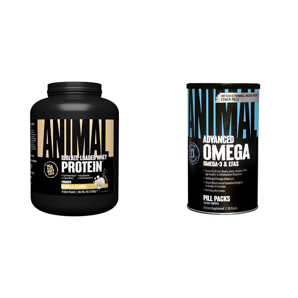 This protein and omega supplement bundle packs a powerful one-two punch to help you meet your fitness goals. The Animal Whey Isolate protein powder provides a whopping 25 grams of protein per scoop from high-quality whey isolate that is quickly and efficiently absorbed, making it ideal for post-workout recovery. It mixes smoothly with no chunks or bloating thanks to added digestive enzymes. Animal Omega rounds out the bundle with 30 daily packs that deliver 10 premium omega fat sources including fish, flaxseed, and salmon oils that assist with inflammation, cardiovascular health, metabolism, and more. The individually packed servings make it simple to take Animal Omega anytime, anywhere. Together, these two products complement each other perfectly - the Animal Whey isolate protein helps rebuild lean muscle, while the essential fatty acids in Animal Omega support overall health and workout performance. With this bundle, you'll get amazing-tasting, fast-absorbing muscle-building protein combined with inflammation-reducing omegas for better recovery.
