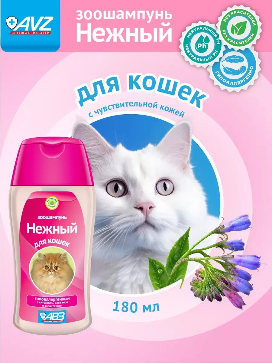 Шампунь Нежный для кошек всех пород. Универсальный гипоаллергенный шампунь - идеальное средство для ухода за животными, страдающими от воспалений и раздражений кожи. Его уникальная формула способствует заживлению кожи и освобождает вашего питомца от зуда и неприятного запаха. Ветеринары рекомендуют использовать этот шампунь для кошек с короткой и длинной шерстью, чтобы улучшить здоровье кожи и шерсти, а также решить проблемы, связанные с линькой, аллергией, кожными инфекциями и перхотью. Шампунь для животных не оказывает раздражающего и чрезмерно обезжиривающего действия на кожу. Он эффективно борется с бактериями, а мягкая формула шампуня бережно и нежно очищает кожу и шерсть от загрязнений, не вызывает аллергических реакций. Натуральный кондиционер хитозан и алое вера увлажняют, питают и восстанавливают шерсть, способствуют легкому расчесыванию. Этот шампунь подходит для всех типов шерсти: белой, рыжей, темной, длинношерстных и короткошерстных котов и кошек, мелких и крупных пород. В состав зоошампуней Нежный входит удивительный природный компонент алое вера, который прекрасно очищает, увлажняет и питает шерсть, придает здоровый вид и восхитительный блеск, укрепляет корни и препятствует выпадению шерсти, улучшает структуру, способствует легкому расчесыванию. Аллантоин натурального происхождения, оказывает увлажняющее и смягчающее действие, стимулирует заживление мелких трещин и ранок, способствует устранению перхоти. Провитамин В5 оказывает заживляющее, увлажняющее, успокаивающее действие, увеличивает прочность коллагеновых волокон, придает блеск, увлажняет шерсть. Кроме того, мы предлагаем широкий ассортимент товаров для груминга, кондиционеры и парфюм для животных, гель для глубокой очистки, бальзамы для ухода за шерстью, а также средства от линьки, перхоти и других проблем кожи и шерсти. Вся наша косметика для животных экологически чистая, Вы можете быть уверены, что наши средства для ухода за животными будут действительно эффективными и безопасными.