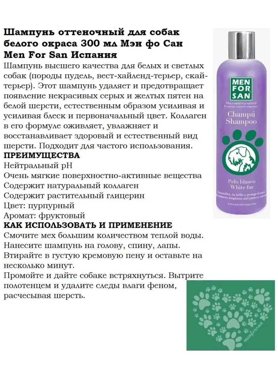 Шампунь оттеночный для собак белого окраса 300 мл Мэн фо Сан Men For San Испания высшего качества для собак с белым и светлым окрасом, улучшающий цвет с натуральными экстрактами (Пудель, вест-хайленд-терьер, Скай терьер). Этот шампунь удаляет неприглядные серые и желтые пятна с шерсти вашей собаки, придаёт блеск. Шампунь не содержит хлора и других агрессивных химических отбеливателей, которые могли бы повредить шерсть. Натуральный коллаген в составе шампуня усиливает и защищает текстуру шерсти, обеспечивая в то же время однородность и шелковистость каждого волоска. ПРЕИМУЩЕСТВА: Нейтральный pH, Очень мягкие поверхностно-активные вещества, Содержит натуральный коллаген, Содержит растительный глицерин, Цвет: пурпурный, Аромат: фруктовый, Смочите шерсть большим количеством теплой воды. Нанесите шампунь голову, спину, лапы животного. Втирайте в густую кремовую пену и оставьте на несколько минут.