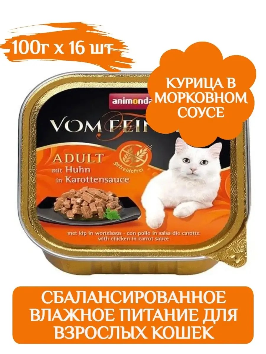 Vom Feinsten (с курицей в морковном соусе) - это сбалансированное, вкусное, здоровое питание на самом высоком уровне для взрослых привередливых кошек от 1 до 6 лет. Специальный отбор и качество мясного сырья гарантируют уникальный кулинарный восторг. Нежная консистенция паштета обеспечивает взрослого кота всеми жизненно важными питательными веществами и адаптируется к потребностям кошек. СОСТАВ: 42% мясо и субпродукты (14% курица, свинина, индейка), овощи (4% морковь, горох), минералы. Аналитика: Белок - 9%, Жир - 5%, Сырая клетчатка - 0,4%, Зола - 1,8%, Влажность - 82%. Пищевые добавки на 1 кг: Йод (E2) 0,1 мг, медь (E4) 1 мг, марганец (E5) 1,4 мг, цинк (E6) 11,4 мг, витамин D3 200 МЕ.