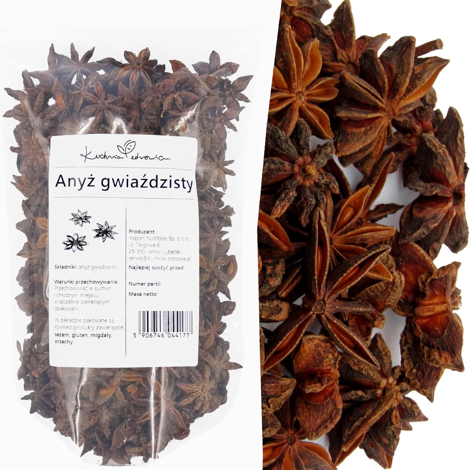 : Natural Star Anise – Unique Flavor and Authentic Aroma Discover the refined aroma and sweet aniseed flavor of Kuchnia Zdrowia star anise. Naturally dried and carefully selected, it enhances your sweet and savory dishes, teas, and infusions. Its star shape and exotic fragrance make it a spice as beautiful as it is delicious. Superior Quality: 100 pure star anise, with no additives or preservatives. Naturally dried to preserve its fragrance and essential oils. Intense Aroma: Sweet and slightly sugary notes, perfect for teas, desserts, Asian dishes, and hot beverages. Versatile Use: Ideal for infusions, pastries, compotes, marinades, meats, and aromatic sauces. A traditional spice with a thousand uses. Natural Product: Non-GMO spice, no artificial colors or flavors. Suitable for vegan and gluten-free diets. Carefully Packaged: Packaged in a resealable bag to preserve the freshness, aroma, and quality of the product for longer. ? Tip: Just one star is enough to flavor an entire dish. store in a cool, dry place away from light. Ingredients: Dried star anise. Instructions: store in a cool, dry place in an airtight container. The best before date is indicated on the packaging label. Safety Warning: The following products are also packaged in this facility: sesame, almonds, products containing gluten, and various tree nuts. Although every effort has been made, the presence of these raw materials in the product cannot be completely ruled out. See more