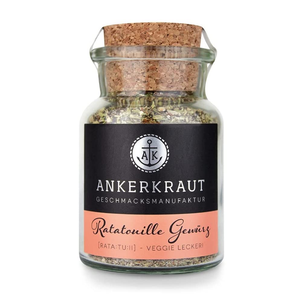 With our spice mix for a delicious Ratatouille, you shake up the French classic with an ease that would make even the little rat in the same animated film speechless. It is hard to imagine that Ratatouille was once a meal for poor people today, when so much taste and fresh vegetables come together. With Mozzarella, the vegetarian stew becomes a real gadget of French cuisine. INGREDIENTS sea salt, tomato chips (tomato, corn starch), black pepper, garlic, raw cane sugar, thyme, rosemary, tarragon, oregano, nutmeg, sage[Gift Idea] Our ratatouille spice not only convinces with its taste, but is also an eye-catcher in every kitchen in its elegant cork glass. Simply give something beautiful, give love, give Ankerkraut!. [RATOUILLE]. [BEST QUALITY] No flavor enhancers or artificial colors. The ingredients are freshly harvested, processed into the classic and elegant Ankerkraut cork jars and shipped to customers after a very short storage time: 1 x 80g ratatouille spice in a cork jar. [Suitable for frying and braising fresh vegetables, sprinkle the spices with love - it's ready.] [Taste] A delicious spice with different vegetables and gratinated with mozzarella, the vegetarian Schmorr dish becomes a true taste of French cuisine. Avec notre mélange d'épices pour une délicieuse Ratatouille, vous secouez le classique français avec une facilité que même le petit rat du même film d'animation serait sans voix. On ne peut plus imaginer que Ratatouille était autrefois un repas pour les personnes pauvres aujourd'hui, quand tant de goût et de légumes frais se rencontrent. Avec Mozzarella, le plat de mijotage végétarien devient un véritable gadget de la cuisine française. INGRÉDIENTS sel de mer, croustilles de tomate (tomate, amidon de maïs), poivre noir, ail, sucre de canne brut, thym, romarin, estragon, origan, noix de muscade, sauge[Idée cadeau] Notre épice ratatouille convainc non seulement par son goût, mais attire tous les regards dans chaque cuisine dans son élégant verre en liège. Offrez simplement quelque chose de beau, offrez de l'amour, offrez Ankerkraut!. [RATOUILLE]. [MEILLEURE QUALITÉ] Sans exhausteur de goût ni colorants artificiels. Les ingrédients sont fraîchement récoltés, transformés dans les pots en liège Ankerkraut classiques et élégants et expédiés aux clients après un très court temps de stockage : 1 x 80 g d'épices ratatouille dans un pot en liège. [Convient pour faire frire et braiser des légumes frais, saupoudrer les épices avec amour – c'est prêt. [Goût] Une délicieuse épice avec différents légumes et gratinée avec de la mozzarella, le plat végétarien Schmorr devient un véritable goût de la cuisine française.