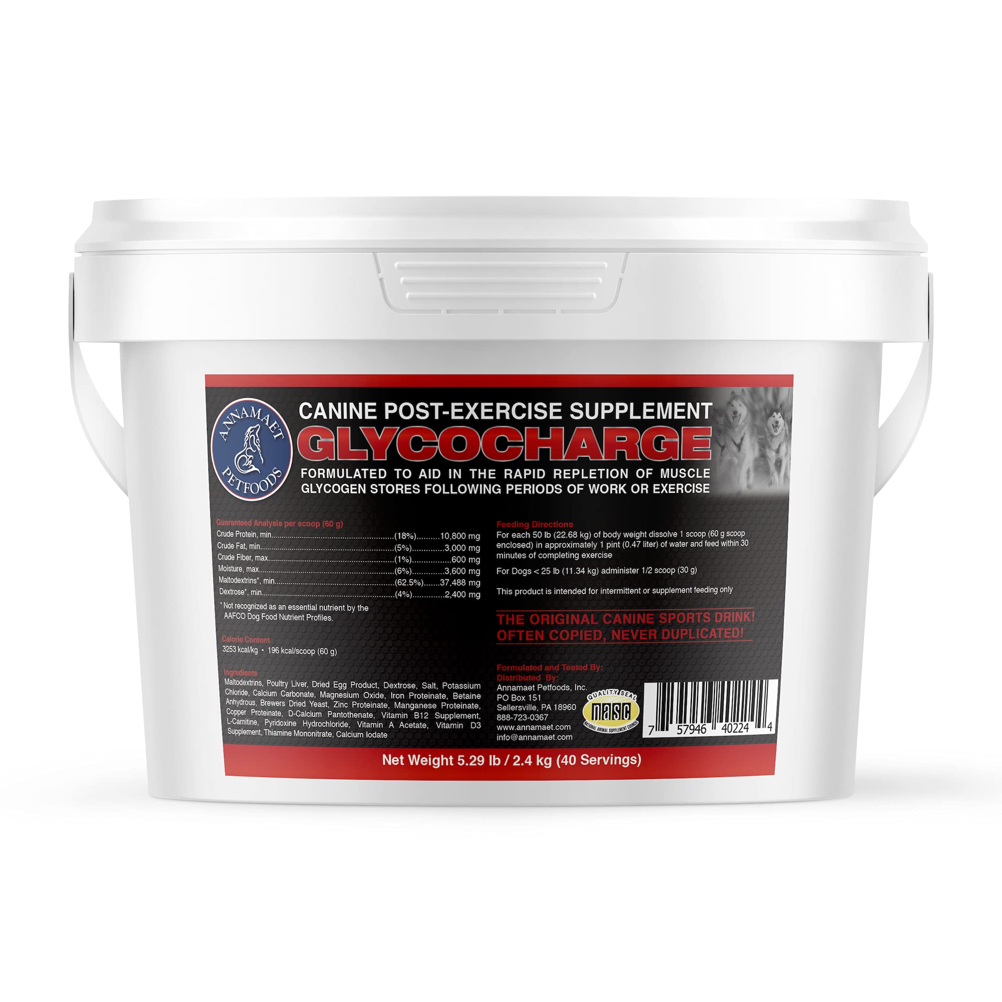 Glycocharge must be given shortly after exercise (ideally within 30 minutes) followed by a 2-hour rest period following Glycocharge feeding. If given beyond the 30 minutes post-exercise window, its effectiveness is diminished. In a study done on exercising dogs, those that were supplemented with Annamaet Glycocharge reached 88 of their pre-exercise glycogen levels 4 hours after consumption, and 97 of their pre-exercise levels after 24 hours! The glycogen levels of dogs that were given water without Glycocharge. supplementation never exceeded 69 of their pre-exercise glycogen levels in the same time span. Annamaet is certified by the National Animal Supplement Council (NASC), the gold standard for animal supplements. Glycocharge is formulated to aid in the rapid repletion of muscle glycogen stores following periods of work or exercise. Glycogen is one of the fuels used by the body during strenuous exercise, it's the fuel that provides endurance and is synthesized from carbohydrates.