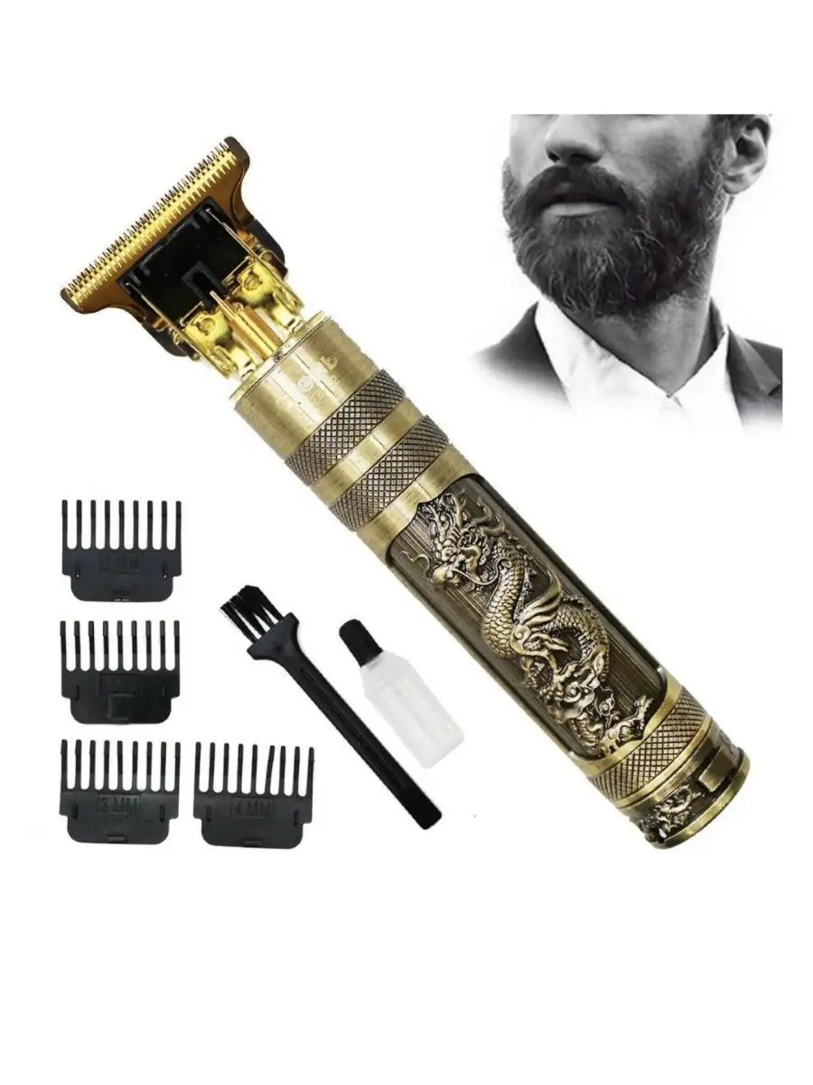 Портативный триммер как в баршопе - беспроводной универсальный девайс для стрижки волос, бороды и усов. Качественная электрическая машинка позволит хорошо экономить на парикмахерской и стилисте, на покупке различных кремов для бритья и сменных головок для бритвенного станка, на бритве металлической и кассет для бритья. Шейвер предназначен для ежедневного чистого сухого бритья щетины, использования дома и в дорожных условиях. Подровнять контуры бороды поможет безопасная бритва. Машинка для бритья мужская не вызывает раздражения кожи, легко обслуживается. В комплекте идет электротриммер, смазочное масло и маленькая щеточка для ухода за инструментом, 4 сменные насадки 1.5, 2, 3, 4 мм. Приятный дизайн и эргономичная ручка электробритвы позволяют удобно держать ее в руке. Кнопка включения/выключения находится снизу - с торца ручки, что позволяет не задеть её во время бритья или стрижки. Цвет черный или золотистый (с рисунком дракон). Главные особенности прибора: железный водонепроницаемый корпус, позволяющий промывать систему после коррекции и стрижки, острые лезвия из нержавеющей стали и легкий алюминиевый корпус вместо пластика. Подстригательная машинка стрижет не хуже, чем профессиональный или premium (премиум) качества аппарат. Набор по уходу за бородой удаляет лишнюю длину. В комплекте также имеется зарядное устройство и аккумуляторная батарейка. Тример отлично сбривает волоски различной жесткости. Многофункциональный триммер для бритья головы, подмышек, подходит для бровей, для мужской интимной зоны и для тела. Это универсальная машинка для чистки лица от волос. Возможно использование с машинкой для полировки волос, стайлером для укладки волос, электрическим женским депилятором для депиляции. Машина для стрижки с щеткой и зарядкой будет отличным подарком на день рождения, 23 февраля, годовщину, день святого Валентина и любой другой праздник мужу, брату, отцу, папе, дедушке, сыну, внуку, коллеге и любому человеку. Электробритва - недорогой бюджетный подарок.