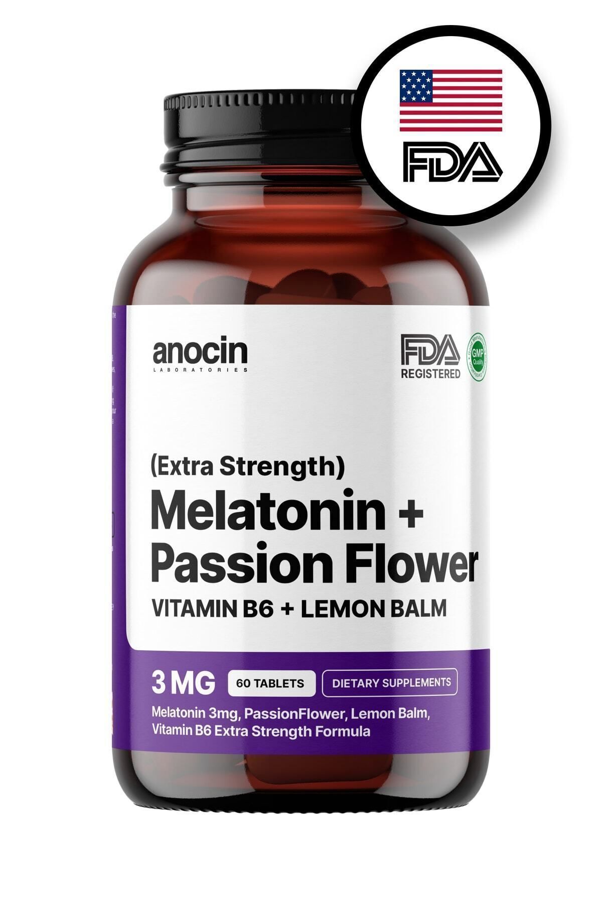 • Anocin Melatonin 60 tablets. Melatonin extra formula. Passiflora Vitamin B6 and Lemongrass Supplement Sleeping Pills Calming Chewable Tablets - Better Sleep. Melatonin amount: 3mg. Passiflor amount: 30mg, Lemongrass extract: 10mg, Vitamin B6: 5MG. 60 Chewable Tablets. Melatonin: Melatonin improves sleep patterns and quality, helping to slow down the skin aging process. PASSIFLORA is an amino acid that helps our brain stay calm and focused. This helps improve the quality of sleep. Warning: It is recommended to use 1-2 tablets daily for adults aged 18 and over. "It should not be used by pregnant or breastfeeding women and persons under the age of 18.", "It should not be used bydrivers, operating machinery, or consuming alcohol while using this product.", "It should not be used for more than two months."
