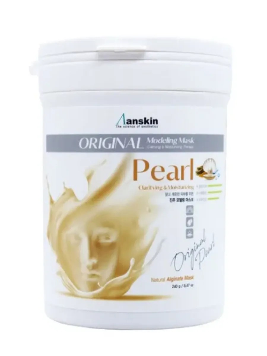 Anskin Pearl Modeling Mask Осветляющая альгинатная маска с жемчужной пудрой 240г. Основные действующие компоненты: Жемчужная пудра является измельченным жемчугом и перламутром; оказывает отличное омолаживающее и ранозаживляющее действие, отбеливает; Оксид Цинка отлично сочетается с различными природными фильтрами, регулирует работу сальных желез, оказывает обезораживающее и вяжущее действие. Гиалуроновая кислота – мощный увлажнитель, проникая в глубокие слои кожи, наполняет ее влагой изнутри, благодаря чему кожа разглаживается, исчезают поверхностные морщинки, а глубокие становятся менее выраженными. Гиалуроновая кислота стимулирует в тканях выработку эластина и коллагена, а также группирует вокруг себя молекулы воды, что обеспечивает пролонгированное увлажнение. Утолив жажду, даже очень сухая и вялая кожа станет свежей и обновленной. Способ применения: Смешать в миске порошок и воду в соотношении 1:0,8 (на 100г порошка 80мл воды); Быстрыми движениями перемешайте до однородной массы при помощи шпателя. При помощи шпателя нанесите маску слоем 3-5 мм на очищенную кожу лица, оставляя открытыми только ноздри. Оставить маску на 20-25 минут до застывания. Удалить её одним пластом, от подбородка ко лбу. Рекомендации: За 2-3 минуты до наложения маски рекомендуется наносить биоактивные сыворотки, кремы или гели. Альгинатные маски при застывания уменьшаются в объеме, за счет чего оказывают на кожу небольшое давление. Этот свойство позволяет усилить проникновение сыворотки или другого средства, нанесённого под маску. Состав: Diatomaceous Earth, Glucose, Algin, Calcium Sulfate, Tetrasodium Pyrophosphate, Magnesium Oxide, Pearl Extract (5,000 ppm), Glycyrhiza Glabra (Licorice) Root Extract, Allantoin, Sodium Hyaluronate, Sodium Benzoate, Potassium Sorbate.