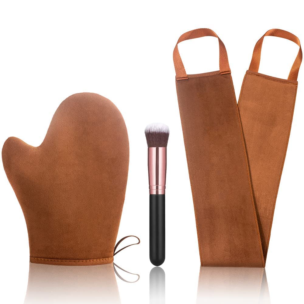 3 pack self tanning mitt applicator kit can satisfy your different needs including 1 tanning mitts self tanner with a thumb, 1 back lotion applicator, and 1 tanning brush. Without the help of others, you can use our self tanner mitt applicator to apply the tanning lotion to every part of the body more cleanly safely, and achieve real self tanning! Premium material Won't stain hands: Ultra soft velvet self tan mitt applicator helps your self tan glide onto the skin smoothly and evenly. The waterproof built-in liner can protect your hands and palms from staining during application. The thumb area gives you extra control. Double-sided Durable use: Our tanning glove for self tan with a thumb design, will give you more control. Both sides of the self tanner mit allow you to use it. The inner seams of the self tanner glove are sewn with needles, no tearing problem! You could get twice or even longer the using life than the single-sided self tanner applicator. The soft self tanner brush is perfect for small and delicate areas that need paying attention, can help to reach blend areas like the foot, toe, hand, and face, effectively avoid uneven self tanner, and get the most natural-looking tan possible. Multi-use Washable: The spray tan mitt is amazing for all self tanning lotions, creams, mousses, oil, sunscreen, and sprays on the market. Our self tanning glove is easy to clean, you can hand wash in warm water, or machine wash and hang dry. With two easy-to-grip handles, the self tanner back applicator can easily help you apply the lotion on your back without help. After-sales service: If you meet any issues with our self tanner kit, please feel free to contact us via , we will reply to you within 24 hours!3 pack tanning mitts self tanner kit can satisfy your different needs including 1 self tan mitt applicator with a thumb, 1 back lotion applicator, and 1 tanning brush. Without the help of others, you can use our self tanning mitt applicator to apply the tanning lotion to every part of the body more cleanly safely, and achieve real self tanning!.