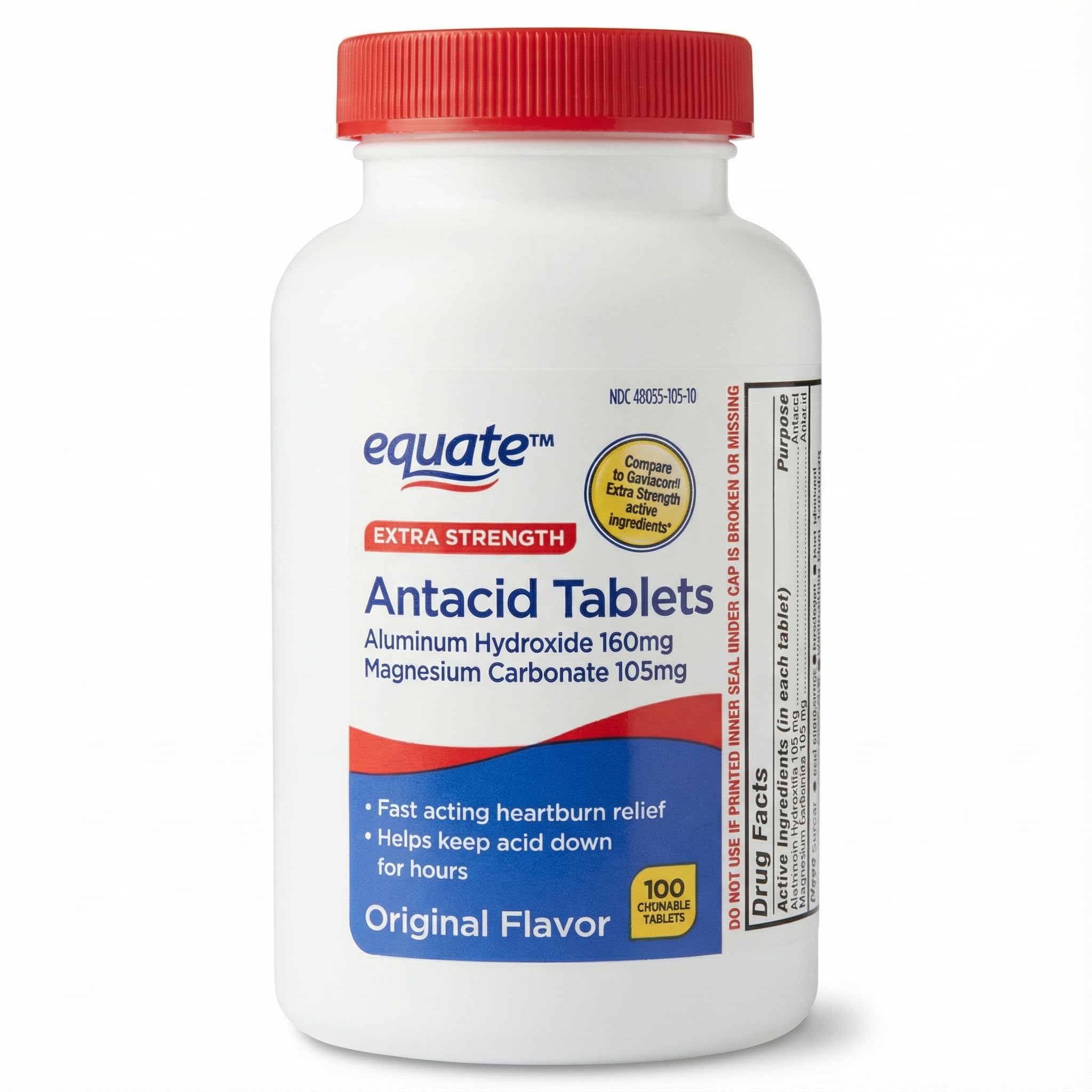 Extra Strength Chewable Antacid Tablets These chewable antacid tablets are formulated to provide fast acting relief from acid indigestion, heartburn, and sour stomach discomfort. Designed for easy use, the chewable format allows convenient intake without water. The formula uses a dual active ingredient system with aluminum hydroxide 160 mg and magnesium carbonate 105 mg per tablet. Together, these antacid ingredients work to neutralize excess stomach acid and create a long lasting antacid barrier. Key Product Features Extra strength chewable antacid tablets Aluminum hydroxide and magnesium carbonate formula Fast acting acid neutralizing support Original flavor chewable tablets 100 count bottle for added convenience Suitable for individuals seeking a dependable antacid option, these chewable tablets support daily comfort after meals or beverage intake. Always follow label directions for proper use.