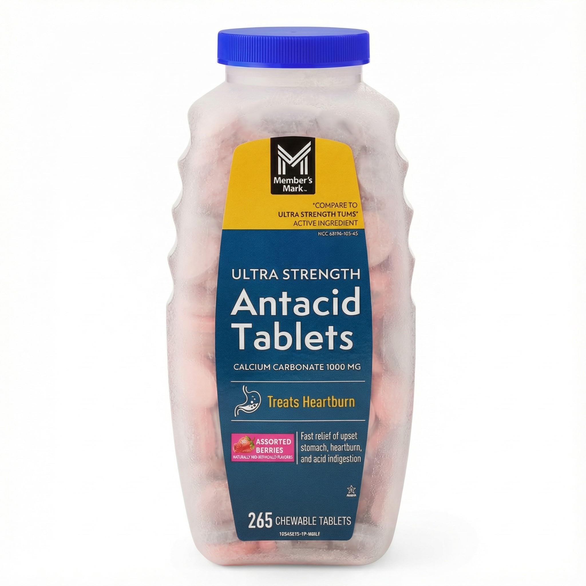 Ultra Strength Antacid Tablets offer fast and effective support for occasional heartburn, acid indigestion, and upset stomach. With 1000 mg of calcium carbonate per tablet, these chewable antacids are formulated to help ease digestive discomfort quickly and conveniently. Each tablet is smooth and easy to chew, with a delicious assorted berry flavor that makes every dose enjoyable. Whether at home or on the go, this value-size pack of 265 chewable antacid tablets ensures you're prepared whenever occasional acidity arises. These anti acid tablets are gluten-free, making them a suitable option for a variety of wellness needs. The clean formula is designed to deliver fast-acting support without unnecessary additives. Calcium Carbonate 1000 mg: High-potency antacid ingredient per tablet. Quick Support for Acid Discomfort: Designed for fast relief from occasional indigestion and heartburn. Gluten-Free: Meets a variety of dietary preferences. Great Taste: Assorted berry flavor chewables for a pleasant experience. Value Size: Contains 265 chewable tablets for long-term convenience. Add these chewable antacid tablets to your routine and be ready to support digestive balance when you need it most.