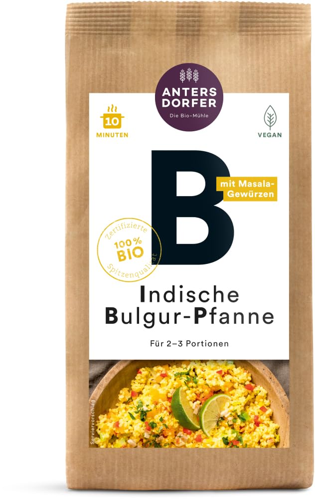 Taste: Storage and Use: Store in a cool, dry place away from light. Processing: Our soft, steamed organic durum wheat bulgur is perfect for quick and satisfying meals. The elegant oriental spices give the dish its Far Eastern flair. Recipe ideas at www.antersdorfer.biotraitement preparation: Serves 2-3 Certified German State Organic Label - EU Organic Label INGREDIENTS BULGUR, dried vegetables (9 ) including onion, mushroom, bell pepper, pumpkin, leek, sea salt, garlic, ground turmeric, ginger powder, chili powder, cumin COOKING INSTRUCTIONS Serves 2-3. First, prepare 400 ml of hot stock. Add the contents of the package to a pan with a little oil, stir in the stock, and return to the heat. Simmer, covered, for 10 minutes and season to taste with salt and pepper. Simmer, covered, for 10 minutes and season to taste. SAFETY WARNING Allergy Information: Yes (included depending on the recipe): Cereals containing gluten, wheat May contain traces of: Cohora wheat, spelt, rye, barley, oats, soy, tree nuts, almonds, hazelnuts, walnuts, sesame No (not tested): Crustaceans, eggs, fish, peanuts, milk, lactose, cashews, pecans, Brazil nuts, pistachios, macadamia nuts, celery, mustard, sulfites, lupin, molluscs See moreAntersdorfer - Die Bio-Müh le Poêle à boulgour bio indienne (2 x 150 g)DESCRIPTION DU PRODUIT DESCRIPTION DU PRODUIT Goût : conservation et utilisation : conserver au frais, au sec et à l'abri de la lumière Traitement : notre boulgour de blé dur bio cuit à la vapeur doux est parfaitement adapté pour une cuisine rapide et complète. Les élégantes épices orientales donnent au plat son sifflet d'Extrême-Orient. Idées de recettes fines sur www.antersdorfer.biotraitement préparation : préparation pour 2-3 portions Préparez d'abord 400 ml de bouillon chaud. Préparez le contenu de l'emballage dans une poêle avec un peu d'huile, éteignez avec le bouillon et remettez la chaleur. Laisser mijoter à couvert pendant 10 minutes et assaisonner avec du sel et du poivre au goût. Certification en label biologique allemand de l'État - Label UE bio INGRÉDIENTS BULGUR, légumes séchés 9 d'oignon, champignon, poivron, citrouille, poireau, sel de mer, ail, curcuma moulu, poudre de gingembre, poudre de piment, cumin MODE D'EMPLOI Préparation pour 2 à 3 portions. Préparez d'abord 400 ml de bouillon chaud. Préparez le contenu de l'emballage dans une poêle avec un peu d'huile, éteignez avec le bouillon et remettez la chaleur. Laisser mijoter à couvert pendant 10 minutes et assaisonner au goût avec du sel et du poivre selon vos envies. Préparation pour 2 à 3 portions. Préparez d'abord 400 ml de bouillon chaud. Préparez le contenu de l'emballage dans une poêle avec un peu d'huile, éteignez avec le bouillon et remettez la chaleur. Laisser mijoter à couvert pendant 10 minutes et saler selon vos envies AVERTISSEMENT DE SÉCURITÉ Informations sur les allergies : Oui (inclus selon la recette) : céréales contenant du gluten, blé Peut être contenu dans des traces : blé de cohora, épeautre, seigle, orge, avoine, soja, fruits à coque, amandes, noisettes, noix, sésame Non (sans analyse) : crustacés, œufs, poisson, arachide, lait, lactose, noix de cajou, noix de pécan, noix du Brésil, pistaches, noix de macadamia, céleri, moutarde, sulfite, lupin, mollusques Voir plus