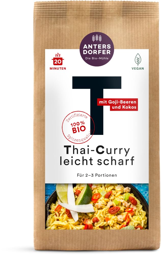 Taste: Storage and usage tips: Store in a cool, dry, and dark place. Finishing touches: Fine recipe ideas at www.antersdorfer.bio. Preparation: Serves 2-3. Place the contents in a saucepan, 300 ml. Add water, 150 ml coconut milk, and 1.5 teaspoons of soy sauce. Once boiling, reduce heat. After approximately 20 minutes, the rice should be slightly firm to the bite. Goji berries and coconut complete the dish. Certifications in German EU organic label INGREDIENTS White basmati rice, thinly sliced soybeans, goji berries 7 , dried vegetables 6 (bell peppers, leeks), grated coconut 3 , vegetable stock, sea salt, corn starch, mixed vegetables (carrots, onions, and parsnips), corn glucose syrup, sunflower seed oil, spice blend (turmeric, ginger, nutmeg, and pepper), herb blend (parsley, lovage, and bay leaves), curry powder, coriander, turmeric, cinnamon, fenugreek seeds, cumin, cardamom, ginger, bell pepper, allspice, nutmeg, cloves, pepper, dried garlic, sea salt, black pepper, chili powder COOKING INSTRUCTIONS Serves 2-3. Add the contents of the package to a saucepan, then add 300 ml of water, 150 ml of coconut milk, and 1.5 teaspoons of soy sauce. Once everything has boiled once, reduce the heat. After about 20 minutes, the rice should still be slightly firm to the bite. Goji berries and coconut complete the dish. Preparation for 2-3 servings: Add the contents of the package to a saucepan, add 300 ml of water, 150 ml of coconut milk, and 1.5 teaspoons of soy sauce. Once everything has boiled once, reduce the heat. After approximately 20 minutes SAFETY WARNING Allergy Information: May contain traces of: cereals containing gluten, wheat, spelt, rye, barley, oats, nuts, almonds, hazelnuts, walnuts, sesame NO (without testing): crustaceans, eggs, fish, peanuts, milk, lactose, cashews, pecans, Brazil nuts, pistachios, macadamia nuts, celery, mustard, sulfites, lupin, molluscs YES (included depending on the recipe): soy See moreAntersdorfer - Die Bio-Müh le Curry thaï bio légèrement tranchant (6 x 150 g)DESCRIPTION DU PRODUIT DESCRIPTION DU PRODUIT Goût : conservation et conseils d'utilisation : stockage frais, sec et sombre Finition : idées de recettes fines sur www.antersdorfer.bioProcessution préparation : préparation pour 2 à 3 portions Mettre le contenu dans une casserole, 300 ml Ajoutez de l'eau, 150 ml de lait de coco et 1,5 cuillère à café de sauce soja. Une fois que tout est ébullition, réduisez la chaleur. Après environ 20 minutes, le riz doit être légèrement résistant aux morsures. Les baies de goji et la noix de coco complètent le plat. Certifications en allemand label biologique UE INGRÉDIENTS Riz basmati blanc, tranches de soja fines, baies de goji 7 , légumes séchés 6 poivrons, poireaux, noix de coco râpées 3 , bouillon de légumes sel de mer, amidon de maïs, mélange de légumes de carottes, oignons et panais, sirop de glucose de maïs, huile de graines de tournesol, mélange d'épices de curcuma, gingembre, muscade et Poivre, mélange d'herbes de persil, livèche et feuilles de laurier, curry coriandre, curcuma, cannelle, graines de fenugrec, cumin, cardamome, gingembre, poivron, piment de la Jamaïque, muscade, clous de girofle, poivre, ail séché, sel de mer, poivre noir, poudre de piment MODE D'EMPLOI Préparation pour 2-3 portionsAjouter le contenu de l'emballage dans une casserole, ajouter 300 ml d'eau, 150 ml de lait de coco et 1,5 cuillère à café de sauce soja. Une fois que tout est bouilli une fois, réduire le feu. Après environ 20 minutes, le riz devrait encore être légèrement résistant aux morsures. Les baies de goji et la noix de coco complètent le plat.Préparation pour 2-3 portionsAjouter le contenu de l'emballage dans une casserole, ajouter 300 ml d'eau, 150 ml de lait de coco et 1,5 cuillère à café de sauce soja. Une fois que tout est bouilli une fois, réduire le feu. Après environ 20 min AVERTISSEMENT DE SÉCURITÉ Informations sur les allergies : peut être contenu dans les traces: céréales contenant du gluten, blé, blé, épeautre, seigle, orge, avoine, fruits à coque, amandes, noisettes, noix, sésame NON (sans analyse): crustacés, œufs, poisson, arachide, lait, lactose, noix de cajou, noix de pécan, noix du Brésil, pistaches, noix de macadamia, céleri, moutarde, sulfite, lupin, mollusques OUI (inclus selon la recette): soja Voir plus