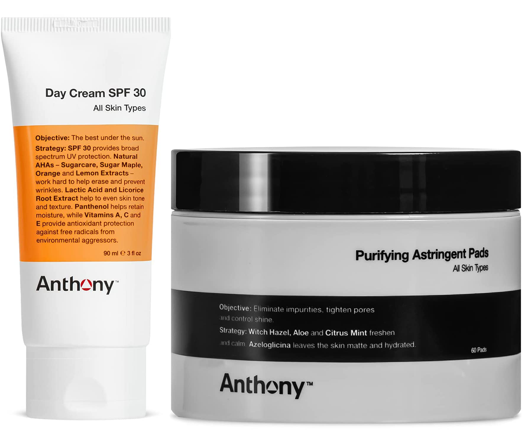 FAVORITE WITH GROOMING EXPERTS — Anthony brand men's grooming products have been featured (and won awards) in top publications, including Men's Health, New York Times, Forbes, GQ, and Esquire. We're also in 850 high-end barber shops across US and Canada. CONTROLS BREAKOUTS AND BLEMISHES — Witch hazel really is an unsung hero of skin care. It not only cleanses and tones pores, it has properties that control acne. Non-irritating formula is gentle enough to use twice a day. EXFOLIATES, CLEANS AND TIGHTENS PORES — Want fresh, clear skin? These exfoliating cotton pads are infused with witch hazel, a plant that's a natural cleanser and astringent. Citrus and mint refresh and give a shine-free matte finish. ANTI-AGING MOISTURIZER — Squalene and glycerin lock in moisture to firm up skin and reduce the appearance of wrinkles. Soy and vitamin E nourish for a healthy, bright, radiant complexion. PROTECTS SKIN FROM DAMAGE — Broad-spectrum SPF 30 sunscreen provides defense against the sun's wrinkle-causing UVA UVB rays while antioxidant vitamin E jumps in to body check free radicals and environmental stressors to keep them out of your face.