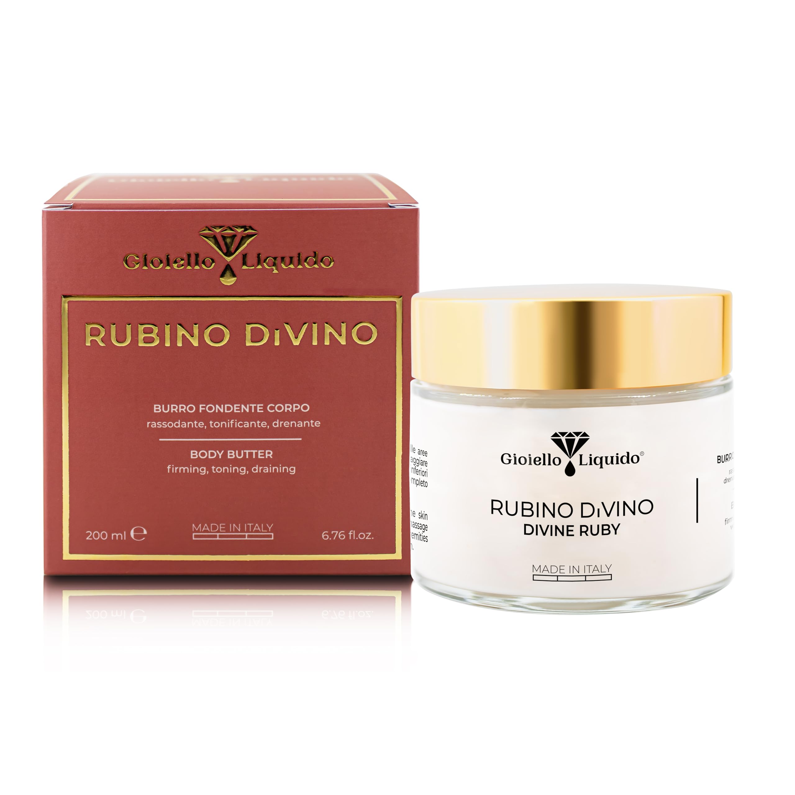 Pour un "effet waouh", Gioiello Liquido a créé le beurre corporel "perfecteur" à utiliser en synergie avec le gommage et l'huile de douche Rubino Divino.