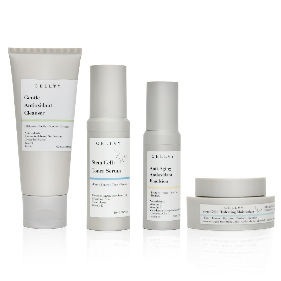 Elevate your skincare regimen with the Revitalizing Anti-Aging Bundle, a complete set of four expertly crafted products designed to cleanse, renew, hydrate, and protect your skin. Infused with the advanced benefits of Moroccan argan tree stem cells, this bundle offers a holistic approach to skincare, targeting signs of aging while promoting a youthful, radiant complexion. Experience the synergy of these powerful products as they work together to rejuvenate and revitalize your skin.NO HARSH CHEMICALS. CELLVY products are formulated without sulfates, parabens, or synthetic fragrances, this cleanser provides a clean, pure cleansing experience. It ensures a safe skincare routine without harmful additives, delivering gentle yet effective cleansing that keeps your skin nourished and protected. DEEP HYDRATION AND NOURISHMENT. Formulated with Hyaluronic Acid and Squalane, this emulsion provides deep hydration, plumping the skin and smoothing fine lines. Squalane creates a moisture barrier, ensuring that hydration is locked in throughout the day, while Hyaluronic Acid draws moisture to the skin, leaving it soft, supple, and radiant. This combination ensures that your skin is hydrated from within, promoting a healthy, dewy appearance. COMPREHENSIVE ANTI-AGING CARE. This Anti-Aging Glow Set uses a blend of potent antioxidants, vitamins, and hydrating ingredients to target multiple signs of aging. It combats fine lines, wrinkles, and sagging by delivering essential nutrients deep into the skin. Vitamin C and Vitamin E protect the skin from free radicals, while Hyaluronic Acid ensures that the skin remains plump and hydrated. Regular use results in a smoother, firmer complexion. ANTIOXIDANT-RICH FORMULA. Packed with antioxidants like Green Tea Extract and Totarol, this cleanser helps fight environmental damage and free radicals, which can contribute to premature aging. The antioxidant properties of these ingredients help neutralize harmful elements from pollution and UV rays. This protects the skin's structural integrity, preserving its youthful appearance and preventing environmental stress. ADVANCED STEM CELL TECHNOLOGY. Infused with Moroccan Argan Tree Stem Cells, this serum supports cellular regeneration and repair. These stem cells help to reduce the visible signs of aging by promoting skin firmness and elasticity. This innovative technology encourages the renewal of healthy skin cells, giving your complexion a smoother, more youthful appearance. The stem cells work at a deeper level, revitalizing the skin from within.