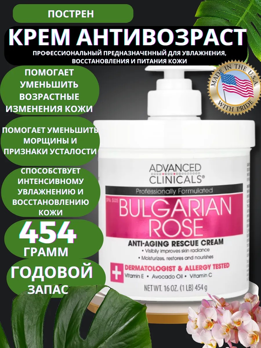 Advanced Clinicals Anti-Aging Rescue Cream с болгарской розой — это профессиональная формула крема, предназначенная для увлажнения, восстановления и питания кожи. Идеален как антивозрастной уход, улучшает эластичность и помогает уменьшить видимые признаки старения.