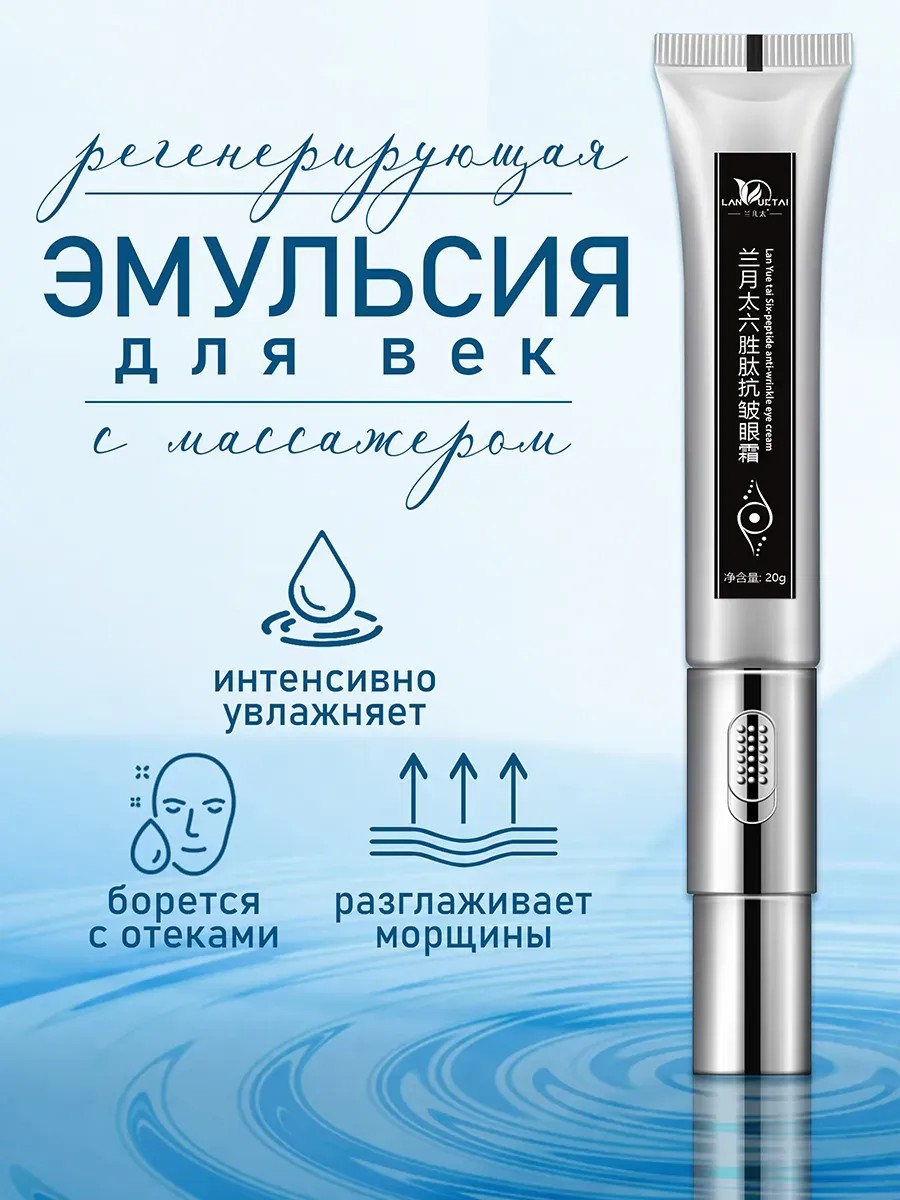Крем для глаз массажирующий с шестью пептидами против морщин и против старения - это универсальное косметическое средство филлер для здоровья и красоты кожи век. Он обладает антивозрастным действием и снижает морщины. Уходовая сыворотка для девушек и женщин глубоко увлажняет и улучшает структуру, стимулирует обновление клеток и синтез коллагена. Благодаря гиалуроновой кислоте в составе,он обеспечивает интенсивное увлажнение, делая кожу более упругой и гладкой. Действие активных компонентов способствует эластичности и упругости, предотвращает появление признаков старения, обеспечивает омолаживающий и успокаивающий эффект. Роскошная кремовая текстура содержит шесть пептидов, которые подтягивают кожу вокруг глаз, сохраняют ее эластичность и устраняют сухость. Они смягчают и укрепляют кожу, расслабляют мышцы глаз и придают очаровательный блеск. Керамиды омолаживают кожу, сохраняя ее эластичность. С их помощью пополняется запас питательных веществ,необходимых для сухой кожи. Экстракт цитрусовых Анжи восстанавливает и тонизирует чувствительную кожу, Натуральные компоненты обеспечивают лифтинг-эффект и заметную подтяжку контура глаз без раздражений. Средство оснащено удобным аппликатором. Массажный ролик способствует улучшению микроциркуляции и распределению состава по поверхности кожи, помогает избавиться от темных кругов, синяков, мешков и отеков под глазами. Каждое применение приносит удовольствие благодаря массажу роллером, который помогает снять усталость. Может использоваться как дневной или ночной уход, подходит под макияж. Крем не принадлежит к категории корейской косметики, но вдохновлен проверенными азиатскими традициями. Крем флюид можно презентовать в подарок маме на день матери, сестре и подруге. Пользоваться кремом очень просто: наносите на область вокруг глаз легкими постукивающими движениями по направлению снаружи внутрь. Сделайте круговой массаж до полного впитывания эмульсии. Подходит для возраста 30, 40, 50, 60 лет и старше. Произведен не в Корее.