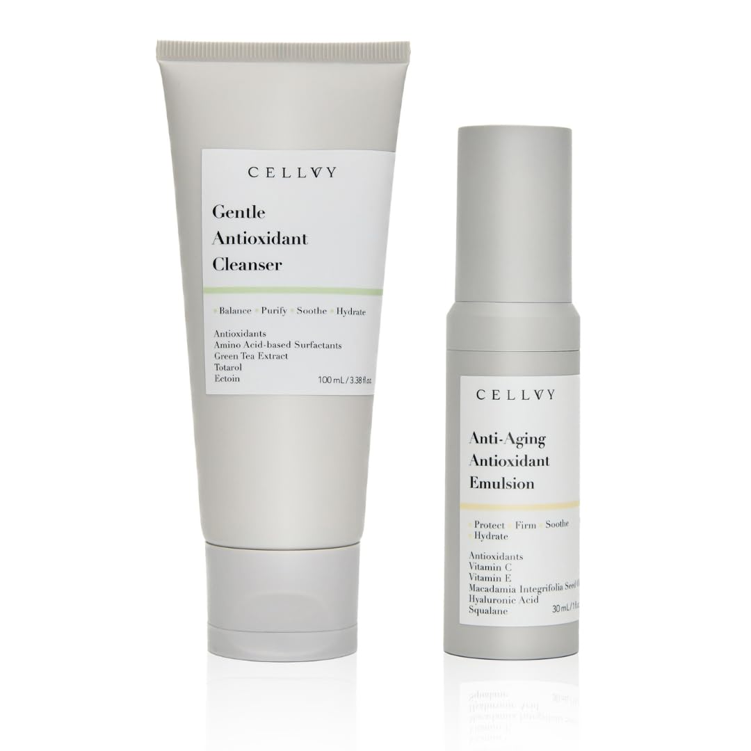 Elevate your skincare routine with our Antioxidant Glow Set, a powerhouse duo designed to cleanse, protect, and rejuvenate your skin. This set combines our Gentle Antioxidant Cleanser and Anti-Aging Antioxidant Emulsion to deliver a balanced, radiant complexion. Experience the perfect blend of potent antioxidants, soothing botanicals, and hydrating ingredients that work together to reveal your skin's natural glow.NO HARSH CHEMICALS. CELLVY products are formulated without sulfates, parabens, or synthetic fragrances, this cleanser provides a clean, pure cleansing experience. It ensures a safe skincare routine without harmful additives, delivering gentle yet effective cleansing that keeps your skin nourished and protected. DEEP HYDRATION AND NOURISHMENT. Formulated with Hyaluronic Acid and Squalane, this emulsion provides deep hydration, plumping the skin and smoothing fine lines. Squalane creates a moisture barrier, ensuring that hydration is locked in throughout the day, while Hyaluronic Acid draws moisture to the skin, leaving it soft, supple, and radiant. This combination ensures that your skin is hydrated from within, promoting a healthy, dewy appearance. COMPREHENSIVE ANTI-AGING CARE. This Anti-Aging Glow Set uses a blend of potent antioxidants, vitamins, and hydrating ingredients to target multiple signs of aging. It combats fine lines, wrinkles, and sagging by delivering essential nutrients deep into the skin. Vitamin C and Vitamin E protect the skin from free radicals, while Hyaluronic Acid ensures that the skin remains plump and hydrated. Regular use results in a smoother, firmer complexion. ANTIOXIDANT-RICH FORMULA. Packed with antioxidants like Green Tea Extract and Totarol, this cleanser helps fight environmental damage and free radicals, which can contribute to premature aging. The antioxidant properties of these ingredients help neutralize harmful elements from pollution and UV rays. This protects the skin's structural integrity, preserving its youthful appearance and preventing environmental stress. SUITABLE FOR ALL SKIN TYPES. Whether your skin is dry, oily, or combination, this gentle antioxidant cleanser works harmoniously with your skin's natural pH balance. The balanced formula ensures that your skin stays hydrated, never over-stripped. It helps regulate oil production in oily skin types while moisturizing and soothing for those with dryness. With a pH-balanced approach, it ensures skin comfort and clarity, making it a universal fit.
