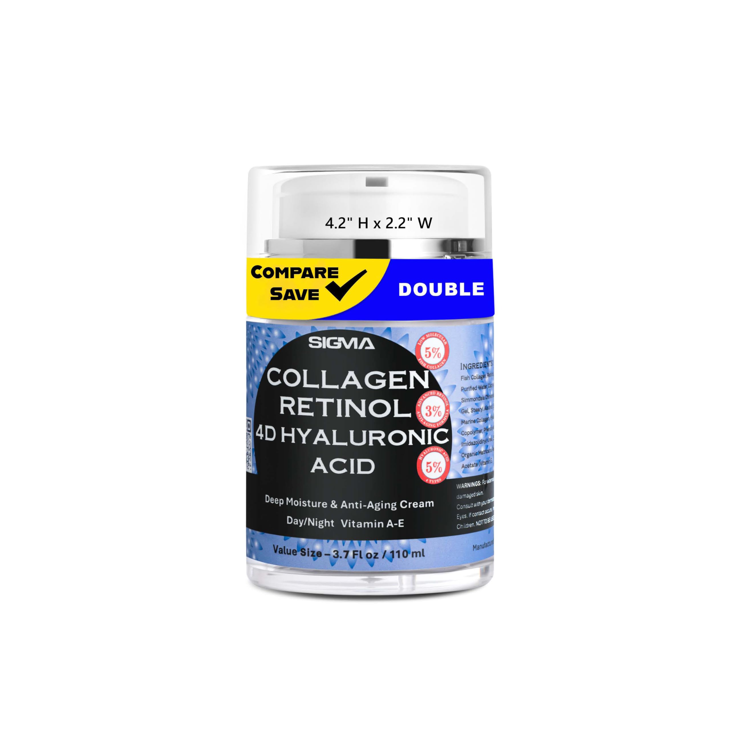 Discover Advanced Anti-Aging Face Cream with Professional-Grade Ingredients Experience why skincare enthusiasts choose Sigma Essentials Anti-Aging Moisturizer Cream. Our carefully-formulated face moisturizer features our exclusive triple-action formula: 5 Marine Collagen, 3 Retinol, and 5 Hyaluronic Acid for enhanced skin appearance. Advanced 4D Hyaluronic Acid for Enhanced Hydration: Our premium face moisturizer features four distinct molecular weights of Hyaluronic Acid. This innovative approach helps maintain skin hydration across multiple layers, supporting your daily anti-aging skincare routine. Premium Anti-Aging Skincare Ingredients: Low Molecular Hydrolyzed Marine Fish Collagen for skin elasticity support Professional-grade Retinol for smoother-looking skin Multi-weight Hyaluronic Acid complex for enhanced moisture Essential Vitamins A and E for antioxidant benefits Suitable for face, neck, and décolleté areas Superior Quality with Innovative Design: Each 3.7 oz (110 ml) moisturizer includes our exclusive touchless dispensing system for hygienic application. With a 3-year shelf life, this anti-aging face cream maintains quality over time.