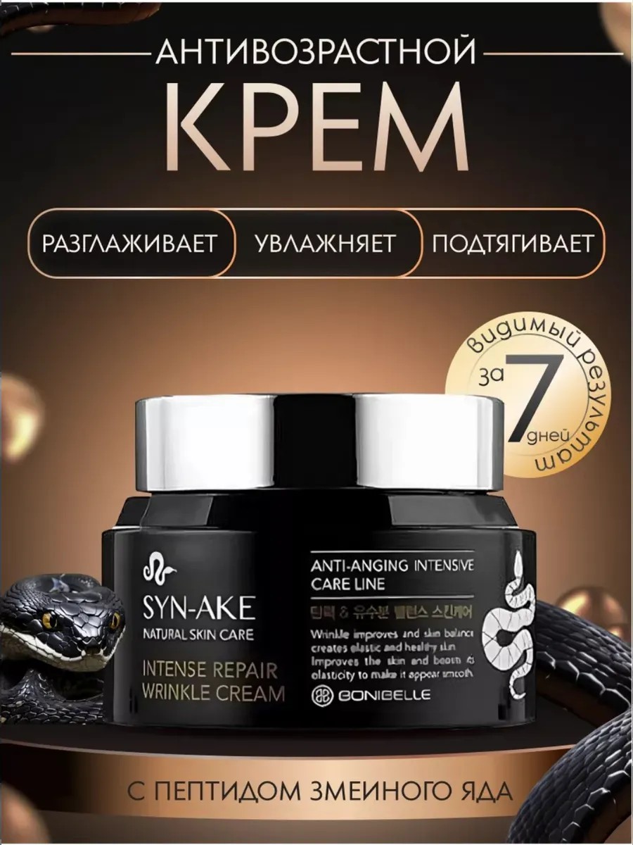 Крем для ухода за кожей увлажняющий с пептидами змеиного яда Syn-ake, действие которого подобно змеиному яду гадюки снижает уровень работы мимической мускулатуры. Крем для лица оказывает ботоксоподобное действие, моделирует контур лица, разглаживает морщины и устраняет заломы на возрастной коже. Экстракт растений и пептид яда змеи безопасно воздействует на кожу лица. Увлажняющая уходовая косметика Syn-Ake хорошо работает с межбровными и лобными антивозрастными морщинами, гусиными лапками. Синтезированный змеиный яд по своему действию похожий на действие яда храмовой гадюки. Подобно тому, как парализуются мышцы человека после укуса змеи, пептид блокирует нервные импульсы, благодаря чему мышцы лица не сокращаются, происходит их расслабление. Молекулы легко достигают нервно-мышечных окончаний и иммобилизуют сокращения мышц лица на 82% в течение 2 часов. Это приводит к постепенному разглаживанию мелких и средних мимических морщин, а также к уменьшению интенсивности глубоких. Комплекс природных компонентов усиливает антивозрастной эффект.