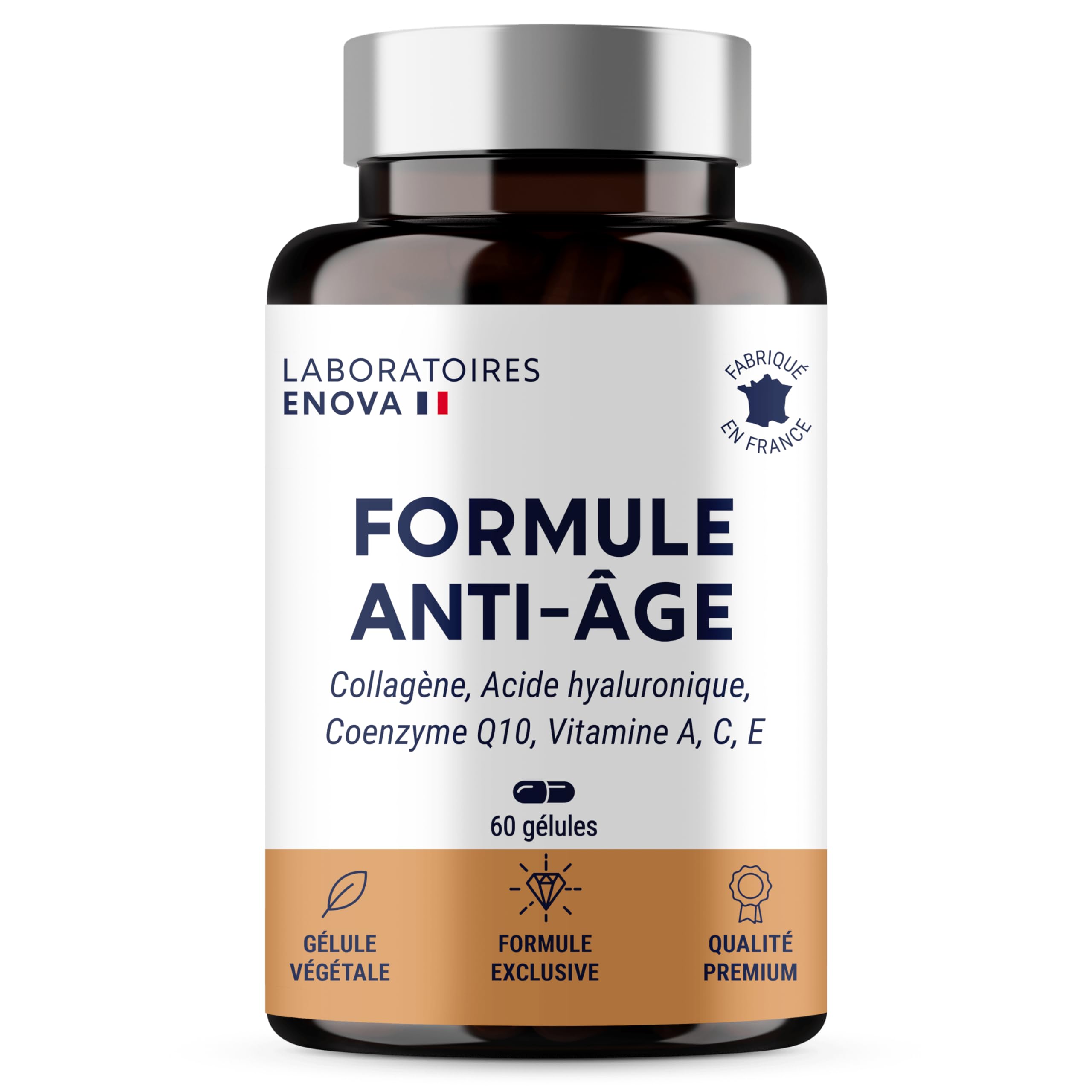 Deodorized hydrolyzed marine collagen peptides (Cartidyss): (fish) type II, Rice (Oriza sativa) flour, Tunic: Vegetable-based capsule (HPMC), Vitamin C, Natural Vitamin E, Hyaluronic acid, Coenzyme Q10, Vitamin A.MADE IN FRANCE: Laboratoires Enova is a 100 French company. Each step is carried out in France: R D is located in Lille, the design team in Nice, manufacturing takes place in Brittany, the logistics team is in Paris and Customer Service in Limoges. MAXIMUM PURITY: Our Anti-Aging Formula is a 100 vegan food supplement, without sweetener, magnesium stearate, GMO, gluten, lactose and titanium dioxide. ✓ HOW TO USE IT? We wanted to develop a simple product to take, so that taking this formula does not become an additional mental burden but becomes automatic every morning: two capsules per day in the morning with a large glass of water. HYALURONIC ACID COENZYME Q10 FOR HYDRATION CELLULAR ENERGY: Hyaluronic acid helps maintain optimal skin hydration, making it more supple and radiant, while Coenzyme Q10 acts as a powerful antioxidant, protecting cells from aging damage and improving cellular energy. MARINE COLLAGEN FOR YOUTHFUL SKIN: Hydrolyzed marine collagen peptides (Cartidyss) type II, derived from fish, are highly bioavailable and known for their effectiveness in supporting skin structure, reducing the appearance of wrinkles and promoting smoother, firmer skin. ANTI-AGING SUPPORT: Specifically designed to support your skin's youthfulness and fight the visible signs of aging, our innovative formula combines essential ingredients to improve skin elasticity, hydration and firmness, while promoting a radiant and revitalized appearance. Peptides de collagène marin hydrolysé désodorisé (Cartidyss) : (poisson) type II, Riz (Oriza sativa) farine, Tunique : Gélule d'origine végétale (HPMC), Vitamine C, Vitamine E naturelle, Acide hyaluronique, Coenzyme Q10, Vitamine A.MADE IN FRANCE : Les Laboratoires Enova sont une entreprise 100 Française. Chaque étape est réalisée en France : la R D est localisée à Lille, l'équipe design à Nice, la fabrication a lieu en Bretagne, l'équipe logistique est à Paris et le Service Client à Limoges. PURETÉ MAXIMALE : Notre Formule Anti-Age est un complément alimentaire 100 vegan, sans édulcorant, sans stéarate de magnésium, sans OGM, sans gluten, sans lactose et sans dioxyde de titane. ✓ COMMENT L'UTILISER ? Nous voulions développer un produit simple à prendre, pour que la prise de cette formule ne soit pas une charge mentale supplémentaire mais que ça devienne un automatisme chaque matin : deux gélules par jour le matin avec un grand verre d'eau. ACIDE HYALURONIQUE ET COENZYME Q10 POUR L'HYDRATATION ET L'ÉNERGIE CELLULAIRE : L'acide hyaluronique aide à maintenir une hydratation optimale de la peau, la rendant plus souple et éclatante, tandis que le Coenzyme Q10 agit en tant qu'antioxydant puissant, protégeant les cellules des dommages liés au vieillissement et améliorant l'énergie cellulaire. LE COLLAGÈNE MARIN POUR UNE PEAU JEUNE : Les peptides de collagène marin hydrolysé (Cartidyss) de type II, issus du poisson, sont hautement biodisponibles et reconnus pour leur efficacité à soutenir la structure de la peau, réduisant l'apparence des rides et favorisant une peau plus lisse et ferme. SOUTIEN ANTI-ÂGE : Spécifiquement conçu pour soutenir la jeunesse de votre peau et lutter contre les signes visibles de l'âge, notre formule innovante combine des ingrédients essentiels pour améliorer l'élasticité, l'hydratation et la fermeté de la peau, tout en favorisant une apparence radieuse et revitalisée.