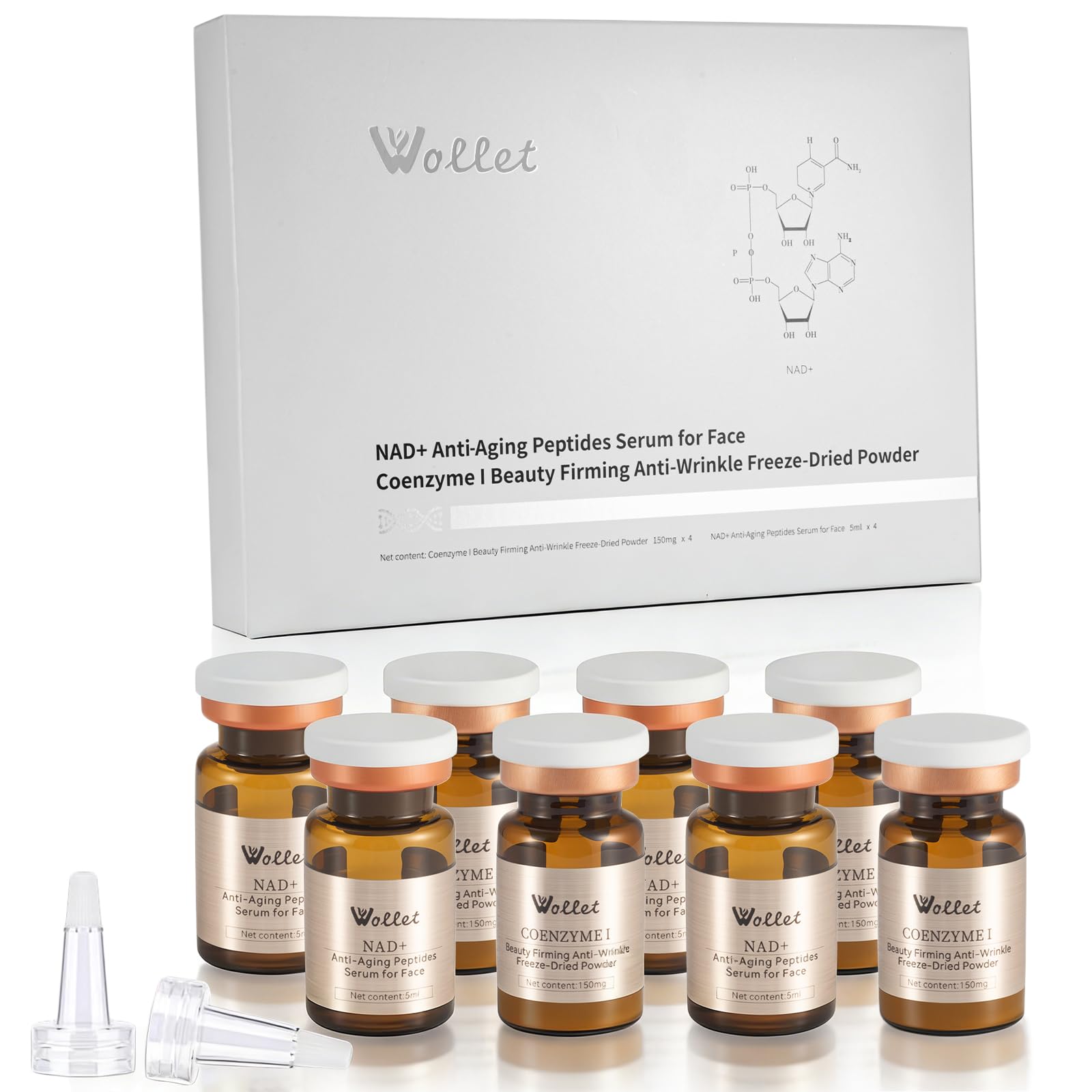 Warm Tips 24-Hour Customer Support NAD peptide boosting serum is designed to be activated immediately upon opening. If not fully used after opening, please store it in the refrigerator to maintain freshness and effectiveness. If you experience any skin discomfort or have questions during use, feel free to contact us anytime—our customer support team is available 24 hours a day to assist you. Gentle Easy: One-Month Skincare Solution This nad Peptide Boosting Serum is fragrance-free and non-comedogenic. formula works for all skin types - even sensitive skin. The complete 30-day supply mixes easily (no microneedling needed and absorbs quickly. Simply add it to your existing skincare routine for noticeable anti-aging benefits without irritation or complicated steps. Radiant Glow: Even Out Skin Tone Naturally Thanks to stabilized niacinamide and antioxidant-rich seaweed extracts, this serum helps fade dullness and promotes a more even complexion. Use it as part of your morning routine under makeup or at night for a refreshed look. Great for special occasions, giving your face tightening and lifting. Hydration Boost: Repair Strengthen Skin Barrier Anti aging serum formulated with hyaluronic acid, skin-replenishing ceramides, and skin-balancing trehalose. This trio works together to deeply hydrate while creating a protective barrier. Ideal for dry winter months or air-conditioned environments, it keeps your skin comfortably plump and resilient - perfect for mature or sensitive skin types that need extra nourishment. Fresh Activation: Maximum Strength from First Use Our innovative two-step system (4 powder vials 4 liquid ampoules) activates when you mix it right before application. This preserves the full potency of key ingredients like niacinamide and NAD precursors. Unlike pre-mixed serums that lose effectiveness over time, you will experience a more noticeable wrinkle repair effect from the first use of the rejuvenate face serum. NAD Peptides: Reduce Wrinkles Boost Skin Firmness This peptides serum for face combines freeze-dried NAD with collagen peptides - two clinically studied ingredients that work synergistically. NAD helps recharge your skin cells' energy, while peptides stimulate natural collagen production. Use after cleansing in the morning and evening. Deep collagen serum can significantly reduce fine lines and restore youthful firmness to the skin.