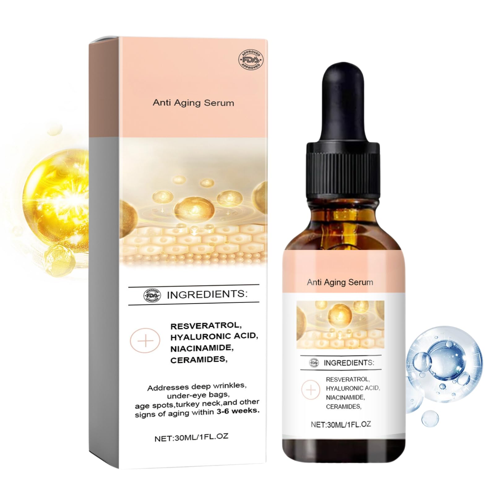 As you grow older, the skin loses its vitality, leaving it dull, dry and dehydrated, that will make you get into trouble. Anti-aging Serum is an Intense Anti-wrinkle Treatment That Uses the Most Innovative Ingredients to Moisturize the Skin, Minimizes Fine Lines and Reduces the Depth of Wrinkles . ANTI WRINKLE SERUM FOR BRIGHTER AND SMOOTHER SKIN 1.The Anti Wrinkle Serum helps penetrate deep intothebottom layer of the skin andimprove skin elasticity and firmness. 2.The Hydrating Serum effectively eliminate fine linesand wrinkles, improve skin textureand make skin smoother andbrighter. 3.The Hyaluronic Acid Serum contains moisturizing andnourishing ingredients, which canprovide long-lasting hydration anoimprove dry skin problems. 4. The Brightening Serum adopts a mild formula and issuitable for all skin types. SPECIFICATION Product Name: Anti-Aging Serum for Face Main Ingredients: resveratrol,hyaluronic acid,niacinamide?ceramide np,collagen Net Content: 30ML Shelf Life: 3 Years Skin Types: Suitable for All Skin Types Storage Method: In a Cool and Ventilated Place USING SUGGESTION Step 1: Wash your face as you usually would and gently pat dry. Step 2: Apply an appropriate amount of skincare serum and rub it in the palm of your hand. Step 3: Use your index finger and middle finger to press around the eyes. Step 3: Gently massage your finger abdomen to help your face absorb. CAUTION 1.Keep out of reach of children. 2.Avoid direct contact with eyes. If contact occurs, rinse thoroughly with cool water. 3.Stop using if redness or irritation occurs, and seek medical assistance if irritation persists. SAFETY WARNING For external use only. Avoid contact with eyes. Keep away from naked flame or direct heat sources?Suitable For All Skin Types?The anti aging face serum is not greasy and sticky, suitable for sensitive skin and all skin types. This face serum for women effectively fight against wrinkles, dry and tired skin and make the skin rejuvenate. ?Lifts and Firms Your Skin?Enhance skin firmness and lift with this powerful firming serum, which works to boost your Skin's Collagen Production and this hyaluronic acid supplements improve skin elasticity and restore a firmer, more lifted appearance, leaving your skin plump, supple, and revitalized. ?Dark Spot Remover for Face?Our brightening face serum is a great dark spot corrector that helps stimulate collagen and elastin cells to penetrate deep into the skin, reduces and prevents skin impairments and removes pigmentation spots. The Smoothing Facial Serum firms the skin, helps reduce wrinkles & age spots and provides a fresh, radiant complexion. ?Strong Antioxidant?Anti Wrinkle Serum with resveratrol is a powerful fat soluble antioxidant that can effectively combat free radicals.This facial serum reduces their damage to skin cells, slow down skin aging, and prevent wrinkles and pigmentation,keep the skin energetic. ?Efficient Moisturizing?Anti-Aging Serum for Face with collagen-boosting hyaluronic acid & nourishing ceramides,delivers a mega hydration hit. The face serum hyaluronic acid improves skin texture with intense moisture and balance.Vitamin c serum deeply moisturizes the skin, making it bright, soft, firm, energetic.