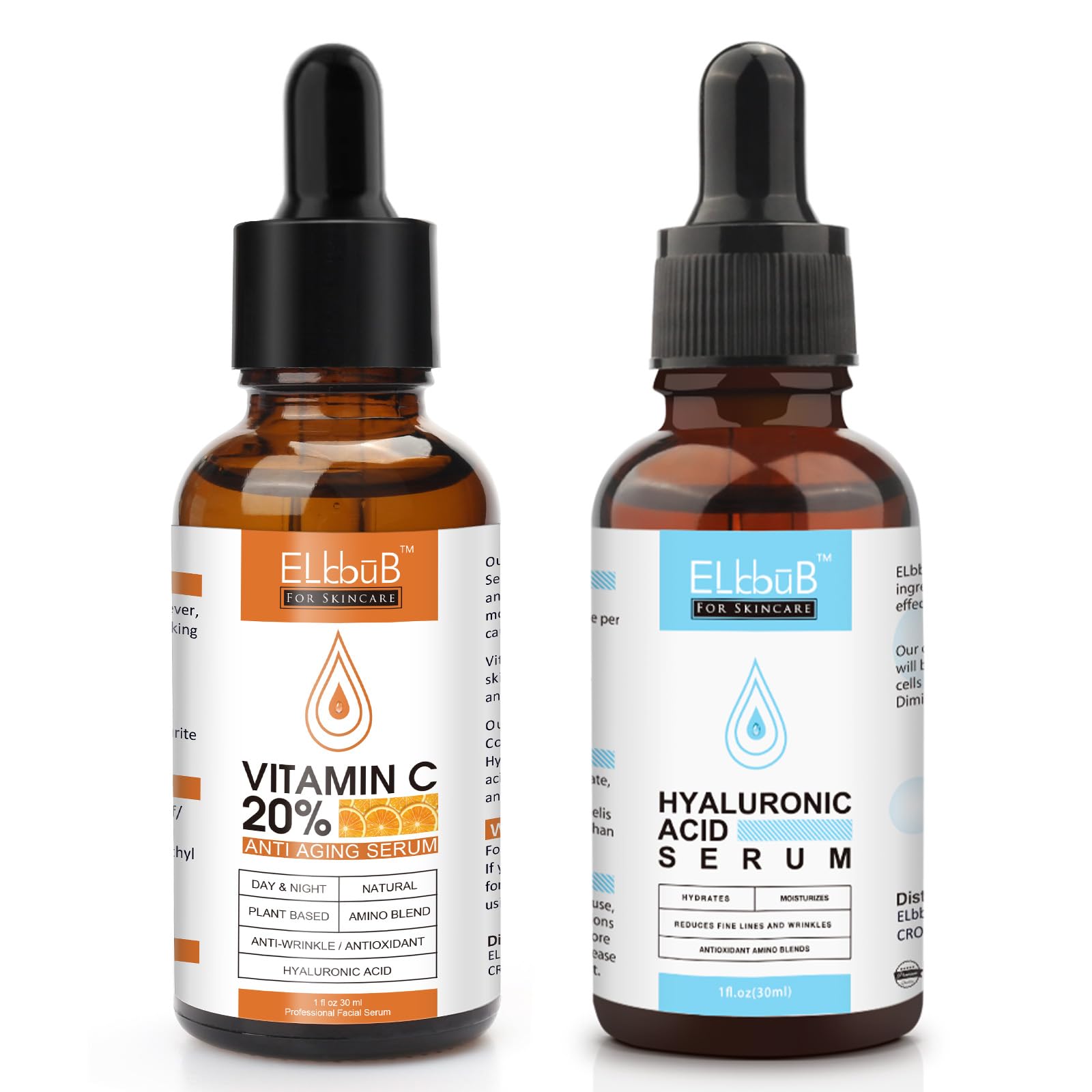 Vitamin C Hyaluronic Acid Serum (Ascorbic Acid) helps your skin to replace old, dead cells with new, fresh ones. Within ELBBUB's best Vitamin C Serum Hyaluronic Acid Serum, many super powerful potent ingredients work together to bring to life a totally youthful combination for your face body. DIRECTIIONS: Can be applied twice daily(morning and night). However, we recommend using the product once per day, working your way up to twice per day. ? 1. Wash your face as usua and pat dry. ? 2. Apply a thin layer of serum over desired areas. ? 3. Allow to dry. ? 4. After serum has dried completely, apply your favourite moisturizer. WARNINGS: For external use only. Not for ophthalmic or oral use. If you currently use any prescriptions or medications for your skin or face please notify your doctor before using. STORAGE: Store in cool dry place way from sunlight. Keep out of reach of childrenSATISFACTION GUARANTEE - You can get 1 30ml ELBBUB Vitamin C Serum and 1 30ml Hyaluronic Acid Serum. 24 Hrs customer service support. If you have any question with this product, please feel free contact us and we'd right here to solve your issue. HOW TO USE - Apply Vitamin C Serum in the morning and Hyaluronic Acid Serum in the evening. Apply 3-5 drops to clean, dry skin on face, neck, and décolleté. Free of synthetic color additives, fragrance, and stabilizers. SUITABLE FOR - This anti-aging serum is suitable for women men and all skin types and can even be used around the eyes. Fastly penetrates deep into the dermal layers of your skin, non greasy. You can easily add this into your daily skincare routine for noticeable results. THE HIGHEST QUALITY HYALURONIC ACID SERUM - Rich in organic and natural ingredients, unique hyaluronic acid, Aloe Extract, Aqua,GIycerine ,Amino Acide, Sodium Hyaluronate and other ingredients, can regenerate and repair sputum, fine lines, wrinkles, dark spots and A region of hyperpigmentation . VITAMIN C SERUM FOR FACE - As you grow older, the skin loses its vitality, leaving it dull, dry and dehydrated. Vitamin C Serum contains Hyaluronic Acid and botanical blend that helps fight against wrinkles and spots. Including Vitamin C Serum in your daily skin care, helps add moisture on face and skin, nourishes the skin and helps to retain its natural glow.