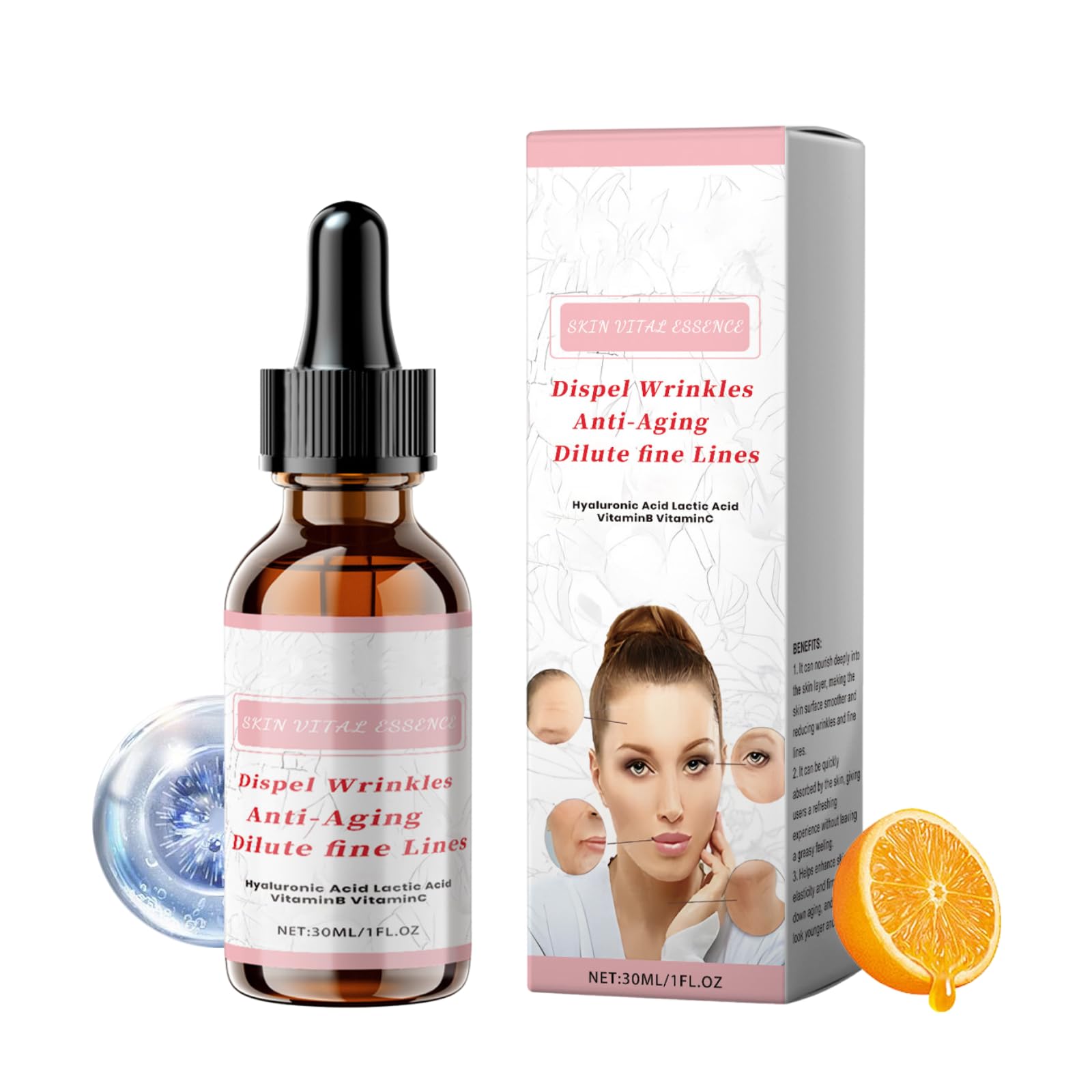 ANTI WRINKLE SERUM FOR BRIGHTER AND SMOOTHER SKIN 1.The Anti aging serum for face can nourish deeply intothe skin layer, making the skin surface smoother ancreducing wrinkles and fineiines. 2.The Dispel Wrinkles Hydrating Serum can be quickly absorbed by the skin, giving you a refreshing experience without leavinga greasy feeling. 3.The Smoothing Facial Serum Helps enhance skin efasticity and firmness,slowdown aging, and make skin look younger and smoother. INNOVATIVE FORMULATION - BEAUTY BENEFITS OF OUR NATURAL INGREDIENTS VITAMIN C ? As an antioxidant, it boosts skin elasticity, firms the skin, pore minimizer, fade dark spots and brighten skin tone. HYALURONIC ACID ? Deeply moisturizes and reduces signs of aging, such as fine lines and wrinkles. SPECIFICATION Product Name: Anti Wrinkle Serum Main Ingredients: Hyaluronic Acid, Ascorbic Acid Net Content: 30ML Shelf Life: 3 Years Skin Types: Suitable for All Skin Types Storage Method: In a Cool and Ventilated Place USING SUGGESTION Step 1: Wash your face as you usually would and gently pat dry. Step 2: Apply an appropriate amount of skincare serum and rub it in the palm of your hand. Step 3: Use your index finger and middle finger to press around the eyes. Step 3: Gently massage your finger abdomen to help your face absorb. CAUTION 1.Keep out of reach of children. 2.Avoid direct contact with eyes. If contact occurs, rinse thoroughly with cool water. 3.Stop using if redness or irritation occurs, and seek medical assistance if irritation persists. SAFETY WARNING For external use only. Avoid contact with eyes. Keep away from naked flame or direct heat sources??Suitable For All Skin Types?Anti aging serum for face is not greasy and sticky, suitable for sensitive skin and all skin types. This face serum for women effectively fight against wrinkles, dry and tired skin and make the skin rejuvenate. ??Lifts and Firms Your Skin?Enhance skin firmness and lift with this powerful anti aging face serum, which works to boost your Skin's Collagen Production and this hyaluronic acid supplements improve skin elasticity and restore a firmer, more lifted appearance, leaving your skin plump, supple, and revitalized. ??Dark Spot Remover for Face?Our Vitamin C Brightening Serum is a great dark spot corrector that helps stimulate collagen and elastin cells to penetrate deep into the skin, reduces and prevents skin impairments and removes pigmentation spots. The Smoothing Facial Serum firms the skin, helps reduce wrinkles & age spots and provides a fresh, radiant complexion. ??Efficient Moisturizing?Anti-Aging Serum with vitamin B & C, delivers a mega hydration hit. Improves skin texture with intense moisture and balance.The hydrating serum deeply moisturizes the skin, making it bright, soft, firm, energetic. ??Anti aging & Oxidation Resistance?Vitamin c serum for face has strong antioxidant properties, which can resist skin damage caused by environmental pollutants and ultraviolet rays, and delay the aging process of the skin. This anti wrinkle serum help reduce wrinkles and fine lines,even skin tone,improve skin elasticity.