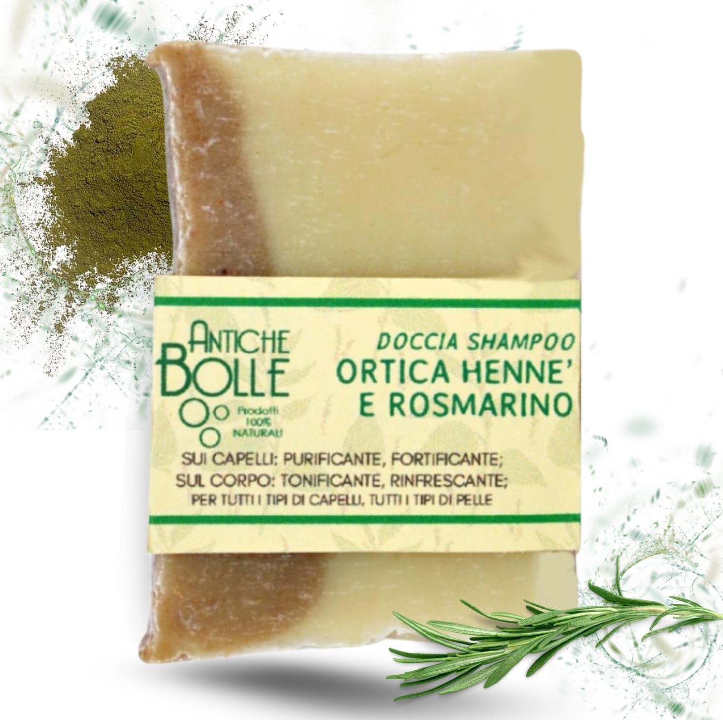 The Antique Bubbles Natural Solid Shower Shampoo is the perfect companion for those seeking a practical and multifunctional product. Formulated with nettle, henna, and rosemary, it offers a dual action: for the skin: it moisturizes, tones, and refreshes the body, face, and hands, leaving a pleasant feeling of cleanliness and vitality. For the hair: it strengthens, purifies, and hydrates, leaving it soft and silky. Suitable for all skin and hair types, it is made from natural and handcrafted ingredients. The cold-process method preserves the beneficial properties of the ingredients, ensuring gentle and effective cleansing. Free of sulfates, silicones, and parabens, it is also a sustainable choice thanks to its eco-friendly and biodegradable packaging. Perfect for a simple routine that's kind to your skin, hair, and the environment. INGREDIENTS Olea europaea (olive) oil, aqua (water), cocos nucifer (coconut) oil, sodium hydrixide, helianthus annuus (sunflower) seed oil, ricinus communis (castor) seed oil, romarinus officinalis (rosemary) oil, eucalyptus globulus (eucalyptus) oil, cedrus atlantica (cedarwood) bark extract, urtica dioica (nettle) extract, lawsonia inermis (henna) extract, roe, maize starch SAFETY WARNING For external use only See moreAntiche Bolle - Shampooing de douche solide 100 naturel à l'ortie, au henné et au romarin - Pour tous les types de peau et de cheveux - Hydratant, tonifiant et fortifiant - 100 gDESCRIPTION DU PRODUIT DESCRIPTION DU PRODUIT Le shampooing douche solide naturel de bulles antiques est le compagnon idéal pour ceux qui recherchent un produit pratique et multifonctionnel. Formulé avec ortie, henné et romarin, offre une double action : pour la peau : hydrate, tonifie et rafraîchit le corps, le visage et les mains, laissant une agréable sensation de propreté et de vitalité. Pour les cheveux : renforce, purifie et hydrate, les rendant doux et soyeux. Convient à tous les types de peau et de cheveux, il est fabriqué à partir d'ingrédients naturels et artisanaux. La méthode de production à froid préserve les propriétés bénéfiques des ingrédients, assurant un nettoyage doux et efficace. Sans sulfates, silicones et parabènes, c'est également un choix durable grâce à son emballage écologique et biodégradable. Parfait pour une routine simple et respectueuse de la peau, des cheveux et de l'environnement INGRÉDIENTS Olea europaea oil, aqua, cocos nucifer oil, sodium hidrixideco, helianthus annuus seed oil, ricinus communis seed oil, romarinus officinalis oilo, eucalyptus globulus oil, cedrus atlantica bark extract, urtica dioique, lawsonia inermis(henn), roe, maize starch AVERTISSEMENT DE SÉCURITÉ Usage extérieur uniquement Voir plusDurable et écologique : 100 naturel, sans sulfates, sans silicone et sans parabène, emballé dans des matériaux biodégradables et recyclables. Convient à tous les types de peau et de cheveux : formule délicate et naturelle, idéale pour toutes les exigences, des cheveux normaux à peaux sensibles. Fortifiant et purifiant pour les cheveux : grâce au henné, nourrit et renforce les cheveux, les laissant doux et légers. Tonifiant et hydratant pour la peau : l'ortie et le romarin rafraîchissent, tonifient et hydratent doucement la peau, en respectant l'équilibre. Nettoyage complet 2 en 1 : un savon solide polyvalent pour le corps, le visage, les mains et les cheveux, idéal pour une routine simple et pratique.