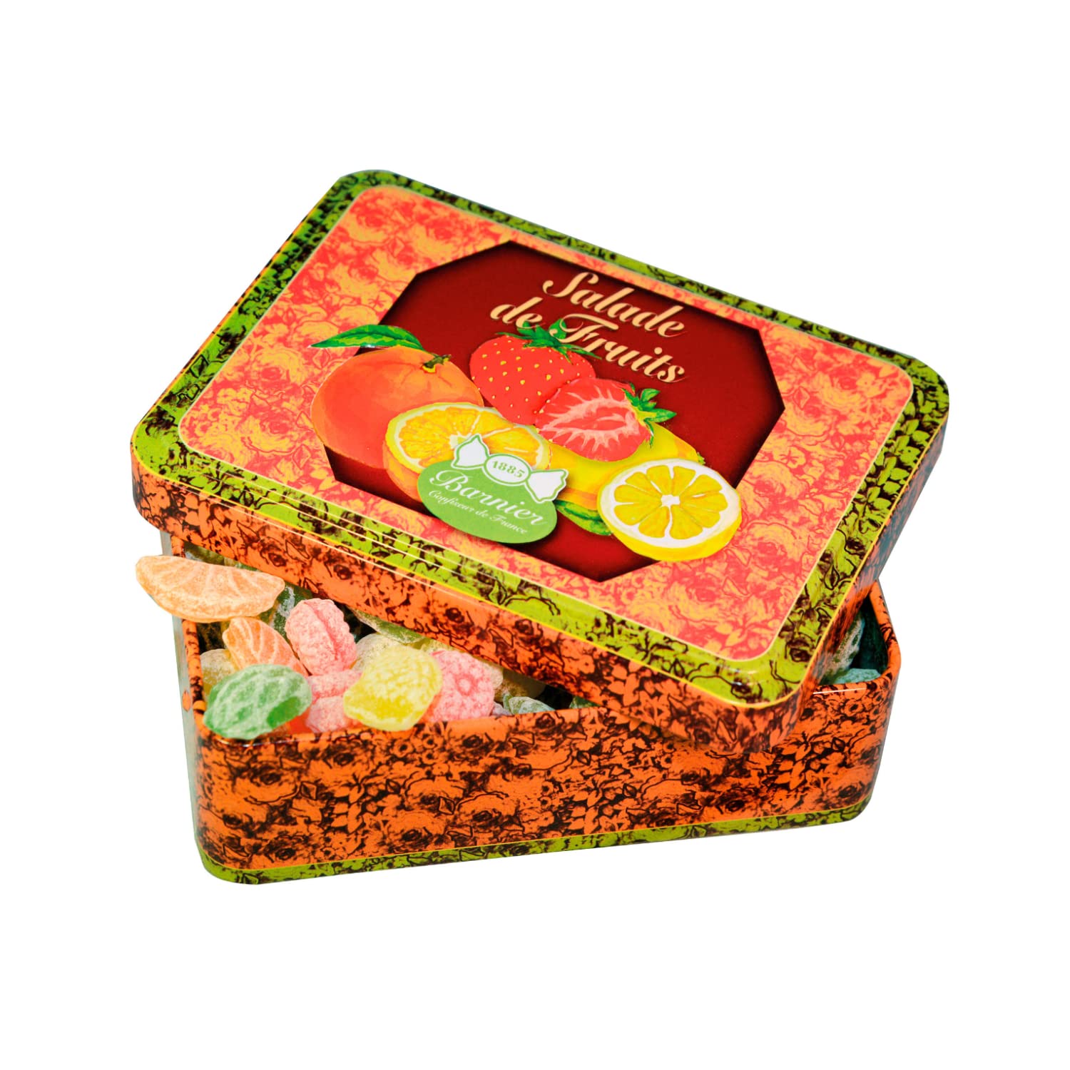 BARNIER CONFESSOR In 1885, Pierre and Marius Barnier created their confectionery factory in Rouen. But it was Eugène Callet who purchased the company in 1900 and made Barnier the benchmark for quality artisanal candies in France. From this centuries-old tradition, Bonbons Barniers has inherited a unique expertise in the processing of cooked sugar. Thus, the master pastry chefs daily perpetuate the values of fine French confectionery: refined natural ingredients, delicious recipes, and elegant craftsmanship. "Fruit Salad": Openable metal tin containing mixed fruit-flavored candies (strawberry, lemon, orange) - (1 x 150 grams). Made in France. [ARTISAN] - Barnier is the benchmark brand that best represents the craftsmanship of quality candy making in France today. [BAKED SUGAR] - Barnier's master pastry chefs perpetuate the values of fine French confectionery every day with their unique expertise in baking sugar. [NATURAL COLORS] - At Barnier, the raw materials used in the production process are all natural and top-quality, as are the 100 plant-based colorants. [HANDMADE] - Barnier bonbons are entirely handmade and enhanced by three manufacturing steps: rolling, spinning, and foraging, making them unique and incomparable. [DETAILS] - The shipment includes 1 metal can, decorated in relief and openable, measuring 4.0 x 12.5 x 9.0 cm, with mixed fruit flavored sweets inside. INGREDIENTS Sugar, blue glucose syrup, flavours, citrus acidifiers, natural colourants, carrots, rosemary, apple juice, potiron, turmeric, paprika, extra spiruline. It can contain traces of dairy products and soft-boiled fruits.Barnier Bonbons au mélange de fruits Bonbons aromatisés au citron, à la fraise et à l'orange Conteneur avec bonbons Tutti Frutti Bonbons aux fruits - 150 grammes.DESCRIPTION DU PRODUIT DESCRIPTION DU PRODUIT BARNIER CONFISEUR Nel 1885 Pierre et Marius Barnier créent la loro fabbrica di dolciumi a Rouen. Ma fù Eugène Callet ad acquistare l'azienda nel 1900 ed a rendere Barnier il marchio di riferimento per le caramelle artigianali di qualità in Francia. Da questa tradizione secolare Bonbons Barniers ha ereditato un savoir-faire unico nella lavorazione dello zucchero cotto. Così i maetsri pasticceri perpetuano quitidianamente i valori dell'alta confetteria francese, raffinatezza delle materie prime naturali, deliziose ricette, elegante lavorazione artigianale. "Salade de Fruits": lattina in metallo apribile con all'interno caramelle aromatizzate alla frutta mista (fragola, limone, arancia) - (1 x 150 grammes). Prodotto en France. [ARTIGIANALE] - Barnier è il marchio di riferimento che meglio rappresenta in Francia ad oggi l'artigianalità nella lavorazione delle caramelle di qualità. [LO ZUCCHERO COTTO] - I maestri pasticceri di Barnier perpetuano quotidianamente i valori dell'alta confetteria francese dal know-how unico nella lavorazione dello zucchero cotto. [COULEURS NATURELLES] - Dans Barnier, la matière prime utilizate durante le lavorazioni sono tutte naturali e di prima qualità, come i coloranti 100 di derivazione vegetale. [FATTE A MANO] - Le caramelle bonbons de Barnier sono completemente fatte a mano ed arrichite da 3 passaggi di lavorazione: laminazione, filatura e foraggio, che le rendono uniche ed incomparabili. [DETTAGLI] - La spedizione comprende 1 lattina in metallo, decorata a rilievo ed apribile, delle dimensioni di cm 4.0 x 12.5 x 9.0, con all'interno caramelle aromatizzate alla frutta mista. INGRÉDIENTS Sucre, sirop de glucose de blé , arômes, acidifiant acide citrique, colorants naturels carotte, groseille, jus de pomme, potiron, curcuma, paprika, extrait de spiruline. Il peut contenir des traces de produits laitiers et de fruits à coque.