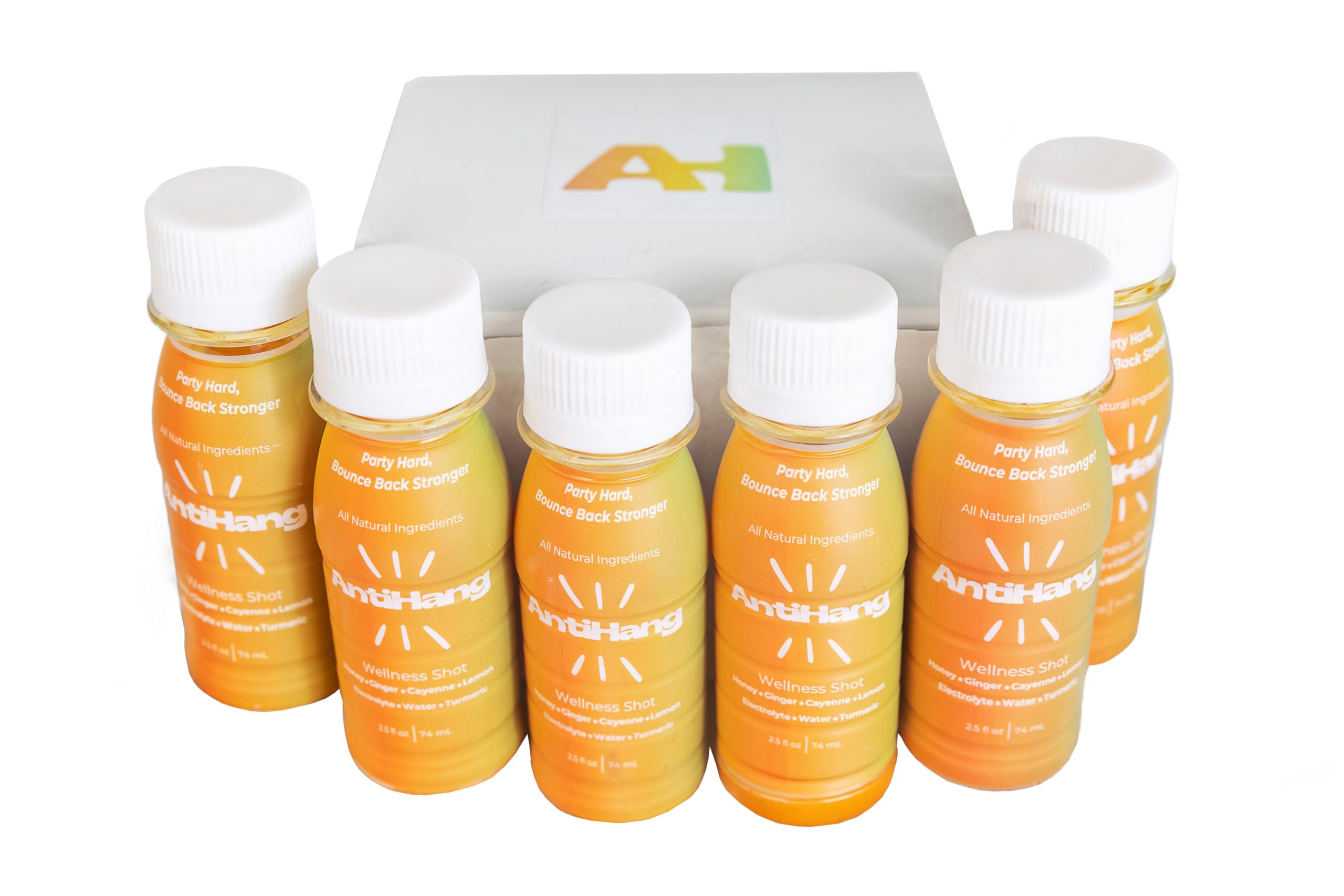 Welcome to Anti-Hang - Your Daily Wellness Revolution We created Anti-Hang because we were tired of choosing between enjoying life and feeling our best the next day. As entrepreneurs who work hard and celebrate harder, we knew there had to be a better way than sugary drinks, chalky pills, or complicated powder mixes. Why Liquid Wellness Works Better Your body absorbs liquids 3-4x faster than capsules or powders. While pills sit in your stomach for 45 minutes breaking down, our 2oz shot delivers bioavailable nutrients directly into your system within 15-20 minutes. It's science, simplified. The Anti-Hang Difference ZERO SUGAR, REAL RESULTS: At just 15 calories with 0g sugar, we use raw honey's natural properties without the sugar crash of competitors (who pack 2-12g per serving). PREMIUM INGREDIENTS THAT WORK: Organic turmeric reduces inflammation. Fresh ginger settles digestion. Cayenne pepper boosts metabolism. Electrolytes restore hydration. Lemon and honey provide antioxidants. Every ingredient earns its place. DUAL-PURPOSE FORMULA: Use it for post-celebration recovery (one before bed, one upon waking) OR as your daily immunity shot for ongoing wellness support. Your body, your choice. NO COMPROMISE CONVENIENCE: Pre-measured, ready-to-drink, TSA-friendly. No mixing, no measuring, no excuses. Perfect for busy professionals, fitness enthusiasts, and anyone refusing to compromise their vitality. Join the Anti-Hang Movement Six shots per pack means you're always prepared. Work hard. Play hard. Recover smart.CONVENIENT 6-PACK FOR ACTIVE LIFESTYLES - TSA-friendly, no refrigeration needed. Whether you're traveling, hitting the gym, or recovering from a night out - stay prepared. Work hard, play hard, recover smart. PREMIUM NATURAL INGREDIENTS - Crafted with organic turmeric, fresh ginger root, raw honey, electrolytes, cayenne pepper, and lemon juice. No artificial sweeteners, no synthetic additives. Clean label wellness shot your body can actually absorb. WEEKEND RECOVERY DAILY IMMUNITY SUPPORT - Perfect for post-celebration bounce back OR your morning wellness routine. Take before bed and upon waking for best results, or use daily for immune system and metabolism support with anti-inflammatory turmeric and ginger. FAST-ACTING LIQUID ABSORPTION - Unlike capsules or powder supplements that take 45-60 minutes to digest, our ready-to-drink ginger turmeric shot delivers nutrients directly. No mixing, no mess, no waiting. Twist, sip, and go. ZERO SUGAR GINGER TURMERIC WELLNESS SHOT - Only 15 calories per 2oz shot with 0g sugar. Our liquid formula with honey, ginger, turmeric, cayenne, electrolytes and lemon absorbs faster than pills or powders - feel the difference in 15-20 minutes, not hours.
