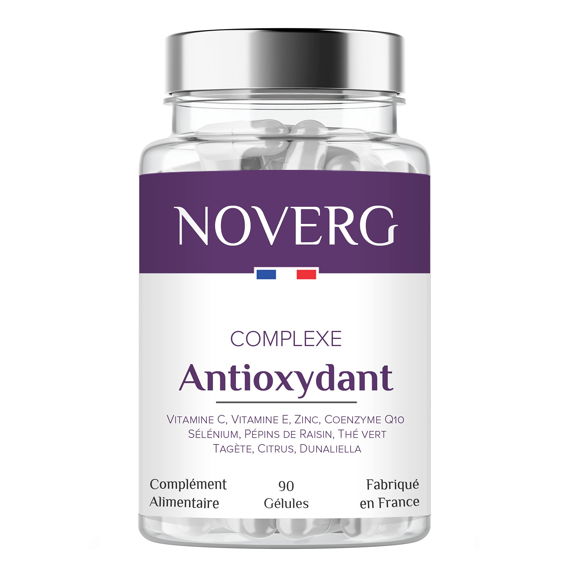 DESIGNED AND MANUFACTURED IN FRANCE: The entire range of NOVERG food supplements is imagined and designed in the Alps and then manufactured in the Brittany and Pays de la Loire regions in state-of-the-art laboratories. In addition, short supply loops are favored for all the ingredients in the formulas. Finally, NOVERG guarantees a supply chain entirely in France: from the laboratory to your mailbox. HIGH QUALITY FORMULA: This formula is composed of pure and naturally sourced ingredients, with recognized beneficial effects, and in optimal dosages. The ingredients are carefully chosen to ensure this formula maximum effectiveness and stability over time. NOVERG claims the highest quality of its products while applying a fair pricing policy for its Customers. 100 VEGAN AND OF NATURAL ORIGIN: Derived from scientific research and nature, this NOVERG formula is characterized by the important complementarity of active ingredients and a 100 Vegan and Clean composition, without substances of animal origin and therefore compatible with Vegetarian Vegan Halal Kosher diets, without controversial excipients or additives such as magnesium stearate or titanium dioxide, GMO-free, Gluten-free and Lactose-free. ? TREAT YOURSELF TO A NATURAL ANTI-AGING CURE: It is a complete combination of classic antioxidant active ingredients (Vitamin E, Selenium, 2 Carotenoids), Vitamin C which promotes the regeneration of collagen, Polyphenols and titrated Bioflavonoids, Beta-Carotene, and Coenzyme Q10. Based on the recognized benefits of plants, it is composed of Grape Seeds (95 OPC), Green Tea, Tagetes, Citrus, Dunaliella in dosages optimizing assimilation, stability and effectiveness. PROTECT YOURSELF FROM THE EFFECTS OF TIME: NOVERG has developed a unique combination of antioxidant micronutrients and plants that contribute to the protection of cells against oxidative stress. By directly neutralizing free radicals, substances responsible for premature aging of the body, antioxidants protect cells from the effects of time and act in particular on the beauty of the skin and wrinkles, which is why they are called anti-aging.CONÇU ET FABRIQUÉ EN FRANCE: Toute la gamme de compléments alimentaires NOVERG est imaginée et conçue dans les Alpes puis fabriquée en régions Bretagne et Pays de la Loire dans des laboratoires de dernière génération. Par ailleurs les boucles d'approvisionnement courtes sont privilégiées pour tous les ingrédients des formules. Enfin, NOVERG garantit une chaine logistique entièrement en France: du laboratoire à votre boite aux lettres. FORMULE HAUTE QUALITÉ: Cette formule est composée d'ingrédients purs et d'origine naturelle, aux effets bénéfiques reconnus, et dans des dosages optimums. Les ingrédients sont soigneusement choisis afin d'assurer à cette formule une efficacité et une stabilité maximales dans le temps. NOVERG revendique la plus haute qualité de ses produits tout en appliquant une politique de prix juste pour ses Clients. 100 VEGAN ET D'ORIGINE NATURELLE: Issue de la recherche scientifique et de la nature, cette formule de NOVERG se caractérise par l'importante complémentarité des actifs et une composition 100 Végan et Clean, sans substance d'origine animale et donc compatible avec les régimes Végétarien Végétalien Halal Casher, sans excipients ou additifs controversés tels que stérate de magnésium ou dioxyde de titane, sans OGM, sans Gluten et sans Lactose. ? OFFREZ-VOUS UNE CURE ANTI-ÂGE NATURELLE: Il s'agit d'une association complète d'actifs antioxydants classiques (Vitamine E, Sélénium, 2 Caroténoïdes), de Vitamine C qui favorise la régénération du collagène, de Polyphénols et de Bioflavonoïdes titrés, de Bêta-Carotène, et de Coenzyme Q10. S'appuyant sur les bienfaits reconnus des plantes, elle se compose de Pépins de Raisin (95 OPC), Thé vert, Tagète, Citrus, Dunaliella dans des dosages optimisant assimilation, stabilité et efficacité. PROTÉGEZ-VOUS DES EFFETS DU TEMPS: NOVERG a développé une association unique de micronutriments antioxydants et de plantes contribuant à la protection des cellules contre le stress oxydatif. En neutralisant directement les radicaux libres, substances responsables du vieillissement prématuré de l'organisme, les antioxydants protègent les cellules des effets du temps et agissent notamment sur la beauté de la peau et les rides ce qui leur vaut l'appellation d'anti-âges.