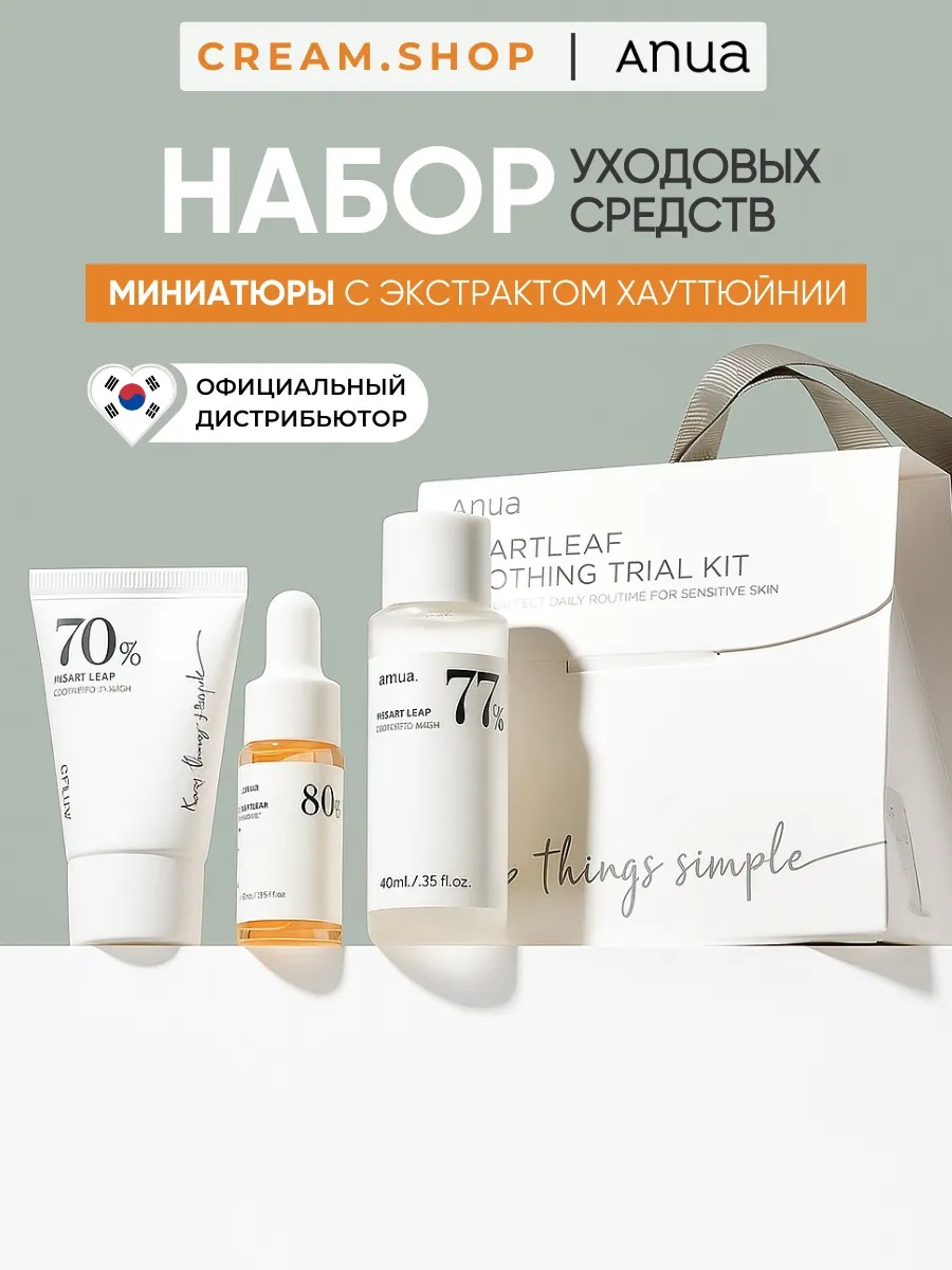 Представляем вам уникальный набор косметики для ухода за лицом от Anua - лидера корейской индустрии красоты! Этот набор содержит пробники и миниатюры косметики, идеальные для дорожного ухода и для знакомства с бестселлерами бренда. В набор входят: 1) отшелушивающие тонер пэды Heartleaf 77% Clear Pad, 2 шт; 2) тонер с хауттюйнией Heartleaf 77% Soothing Toner, 40 мл; 3) сыворотка для лица Heartleaf 80% Soothing Ampoule, 10 мл; 4) лосьон для лица eartleaf 70 Daily Relief Lotion, 20 мл. Незаменимый подарок как женщине, так и мужчине, этот набор предлагает решение для различных проблем кожи, включая акне и прыщи. Специально разработанные средства помогают снять зуд, ускорить процесс восстановления и вернуть коже здоровый и ухоженный вид. Ощутите всю мощь корейского ухода за лицом с этим набором, который станет вашим верным спутником в повседневном уходе. Насладитесь эффективными решениями для борьбы с проблемами кожи и обретите уверенность в своем внешнем виде! Не упустите возможность попробовать анти акне средства от Anua и обрести здоровую и сияющую кожу уже сегодня. Позвольте себе насладиться результатом профессионального ухода и дарите своей коже только лучшее!