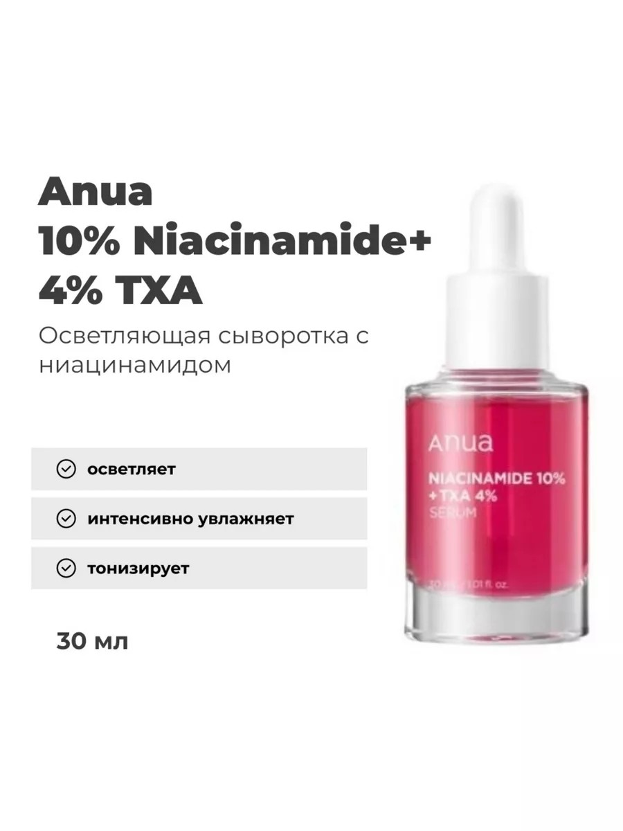 Осветляющая корейская сыворотка Anua Niacinamide 10% + TXA 4% Serum 30 ml с ниацинамидом и транексамовой кислотой работает с гиперпигментацией и неровным тоном кожи.