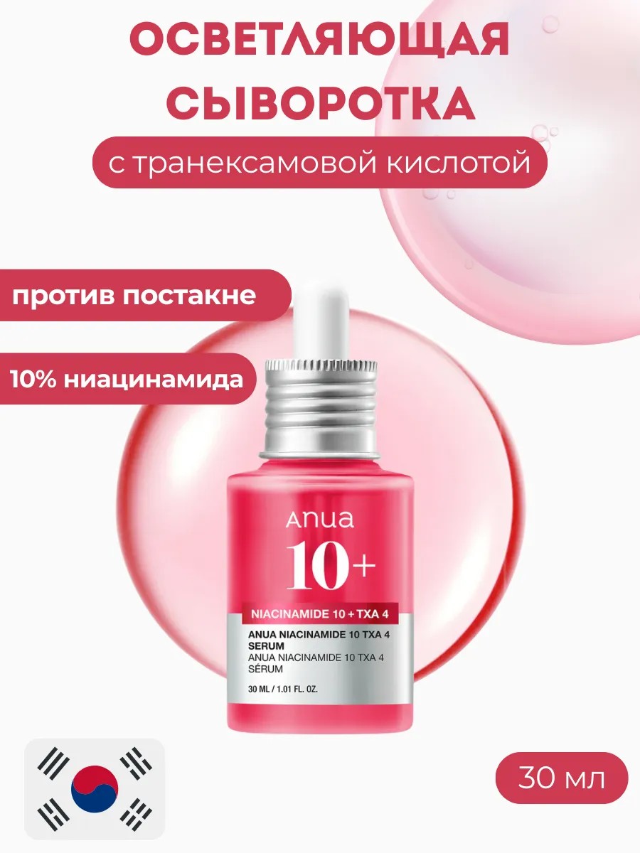Осветляющая сыворотка с транексамовой кислотой Anua Niacinamide 10% + TXA 4% Serum направлена на коррекцию таких несовершенств, как пигментные и застойные пятна, постакне, тусклый и неоднородный цвет лица, чрезмерная жирность кожи. Содержит ниацинамид, софольянс, витамин С, арбутин и растительные экстракты.