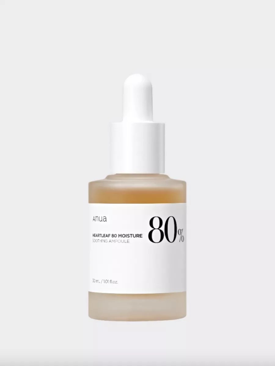 Anua Heartleaf 80% Moisture Soothing Ampoule, a soothing serum with Houttuynia cordata, moisturizes, soothes, and helps combat dehydration.