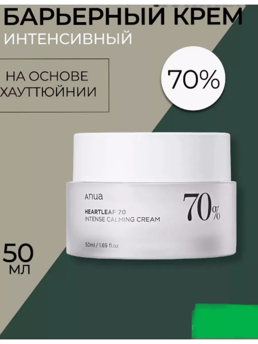 Интенсивный барьерный крем на основе хауттюйнии Anua Heartleaf 70% Intense Calming Cream успокаивает раздражённую кожу, помогает избавиться от зуда и покраснений, снижает чувствительной тканей. Оказывает оздоравливающее действие на кожу с куперозом, уплотняет и укрепляет стенки капилляров.