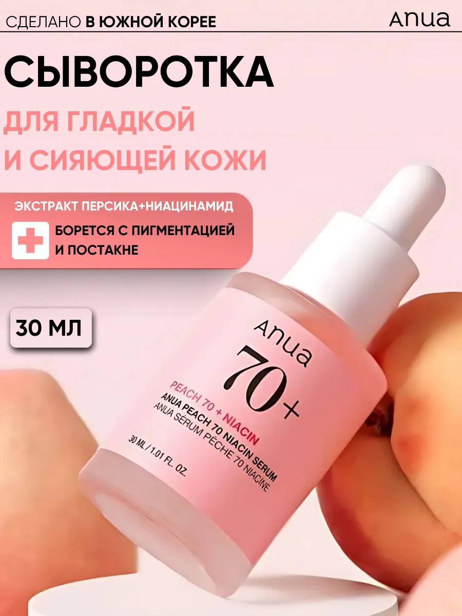Погрузитесь в мир красоты и инноваций с удивительной сывороткой для лица Peach 70% Niacin Serum от Anua - созданной в Корее, чтобы подарить вашей коже совершенный уход! Её увлажняющая формула с 77% экстрактом ферментированного персика не только обеспечивает ровный тон и сияние кожи, но и эффективно борется с расширенными порами, комедонами, чёрными точками, пигментацией, постакне, краснотой и морщинами. В составе средства - ниацинамид 5% и 3 вида гиалуроновой кислоты для достижения максимальных результатов. Благодаря своему комплексному действию, сыворотка осветляет кожу, сужает поры, отбеливает и уменьшает пигментные пятна, а также снимает воспаления и обеспечивает антивозрастной уход. Откройте для себя секрет молодости и красоты с этой уникальной корейской сывороткой - идеальным подарком для любой женщины, а также прекрасным выбором для подростков и для мужчин и женщин. Почувствуйте всю силу ухода за кожей с корейской косметикой Anua!