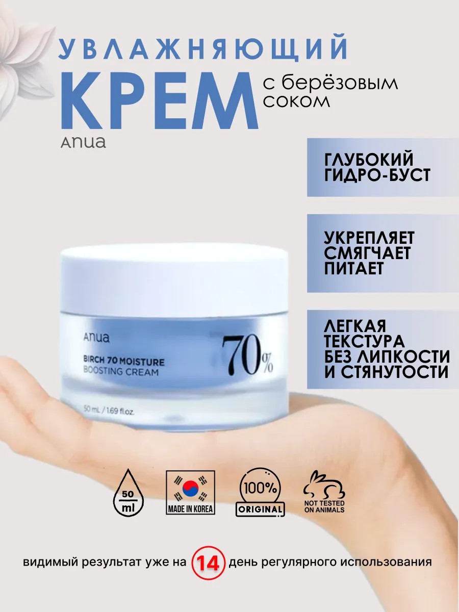 Birch 70% Boosting Cream Moisture, a soothing face cream from the Korean brand Anua, is suitable for all skin types, even oily skin. It effectively relieves dryness and tightness, creating a pleasant cooling effect upon application and helping maintain skin's elasticity and smoothness through deep hydration. It retains moisture, prevents flaking, and soothes irritation.