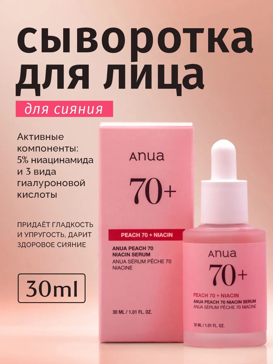 Увлажняющая корейская сыворотка с персиком для сияния кожи и ниацинамидом 5% Anua Peach 70% Niacin Serum (оригинал) выравнивает и полирует рельеф эпидермиса, способствует сужению пор, сокращает выработку кожного сала и мягко осветляет общий тон кожи, у меньшая видимость пигментных пятен.