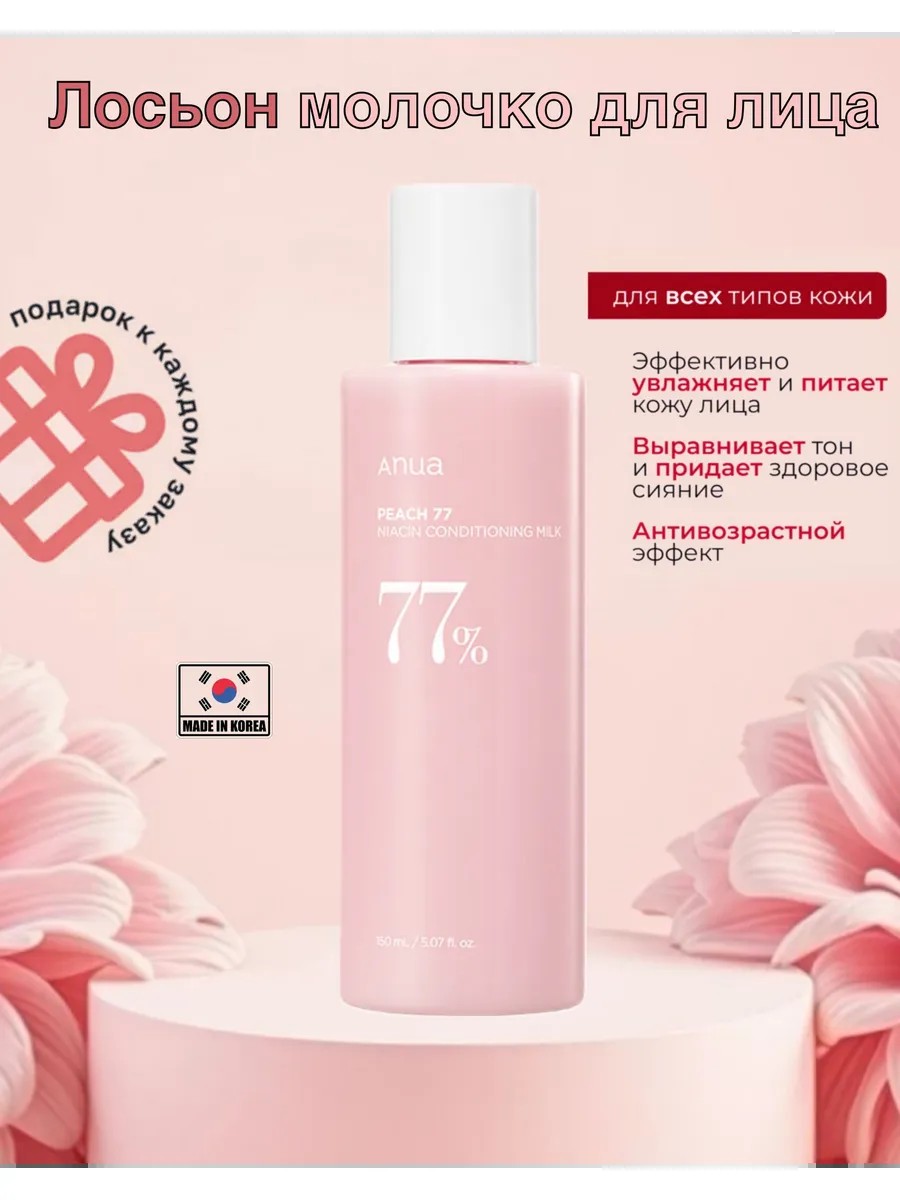 Лосьон-молочко AnuaPeach 77 Niacin Conditioning Milk устраняет тусклость, смягчает огрубевшие участки, увлажняет, разглаживает текстуру. Придаёт здоровое сияние и препятствует образованию пигментации.