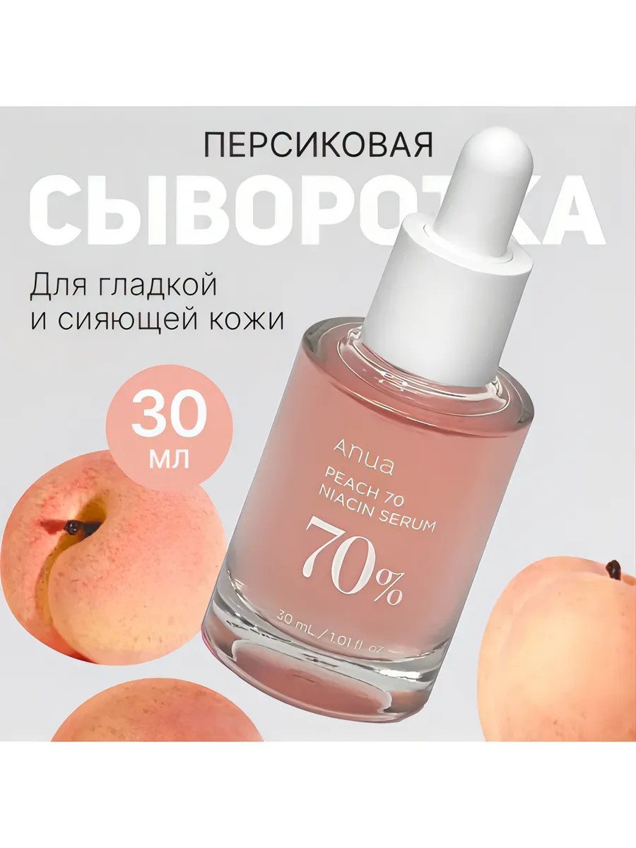 Сыворотка с персиком для гладкой и сияющей кожи Anua Peach 70% Niacin Serum обладает широким функционалом: выравнивает и полирует рельеф эпидермиса, способствует сужению пор, сокращает выработку кожного сала и мягко осветляет общий тон кожи.