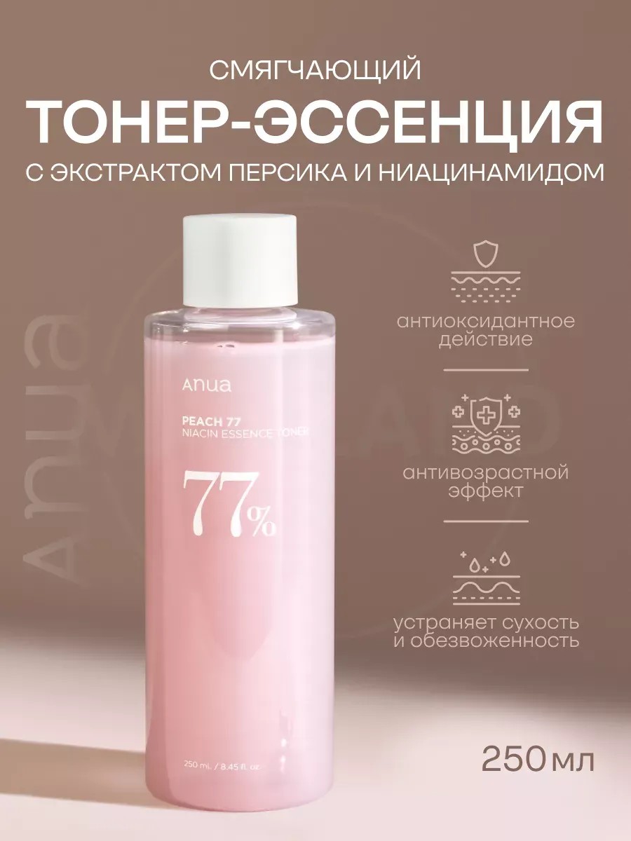 The brightening Korean toner Anua Peach 77 Niacin Essence Toner, enriched with peach fruit extract, fully saturates the skin with life-giving moisture and provides a long-lasting and deep moisturizing effect.