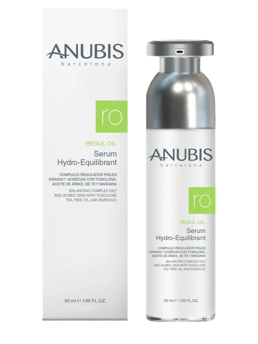 Regul Oil Serum Hydro-Equilibrant, 50 ml. A professional product also suitable for home use as a day and evening care. The serum effectively relieves skin inflammation, soothes, reduces pores, protects from external influences, and eliminates oily shine. Quickly restores a healthy appearance to oily skin, eliminates inflammation, normalizes cellular immunity, and tightens pores. Provides a matte finish and maintains balance throughout the day. The serum contains burdock extract, yeast, tea leaves, thioxolone, B vitamins, allantoin, and panthenol. Amazingly soothes inflamed skin and mattifies it. Reduces pores and protects the skin from adverse external influences. HOW TO USE: Apply with light massage movements until completely absorbed. Anubis Barcelona is a professional aesthetic brand of premium quality, using advanced patented formulas and proprietary synergy. Made in Spain, Barcelona.